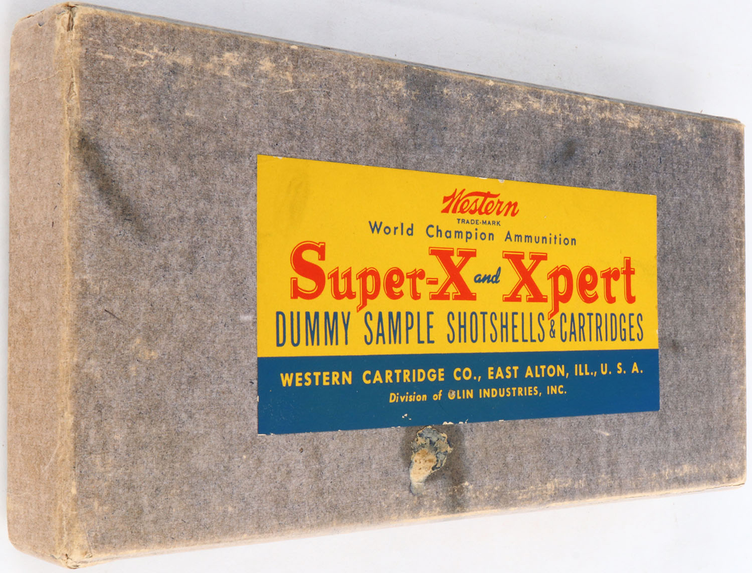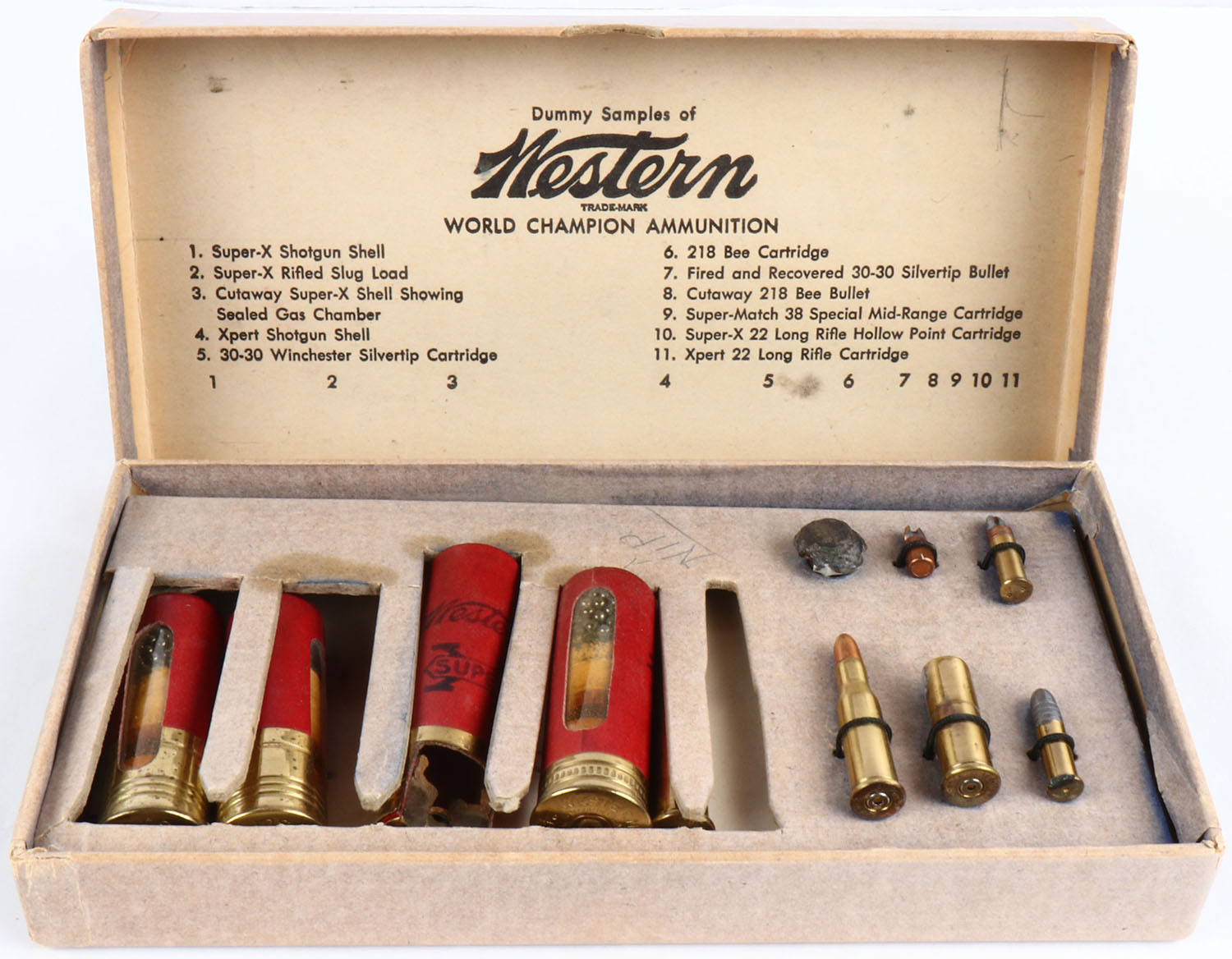 Early Western Salesman Sample Mixed Ammo, 3 Window shells & 1 cut away shells, shells inside are excellent, 5 rifle/pistol rounds 2 bullets one being fired while other is cut away, top of box has yellow, red & blue label with Super-X and Xpert Dummy Sample Shotshells & Cartridges, box has soiling & scuffing. Grade: Excellent - Value: 100 to 400