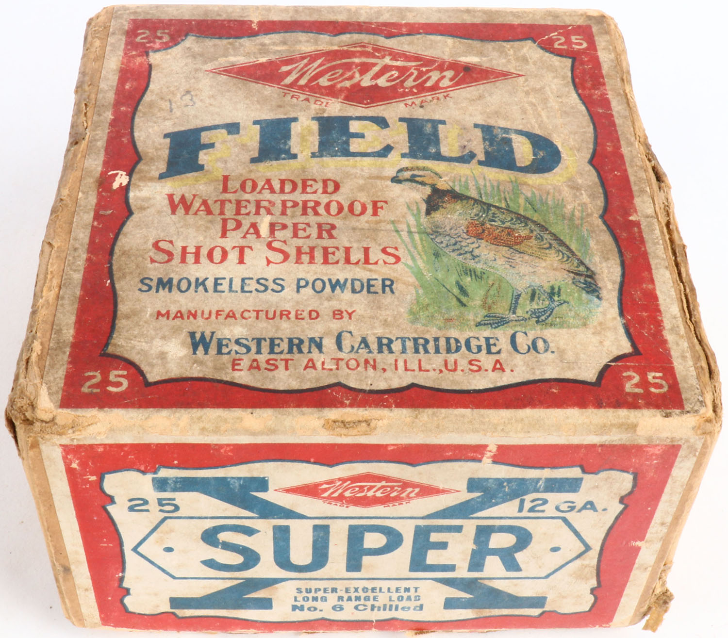 Western, Field/Super X, Label was made during transition from Field boxes to Super X boxes. 12ga., 2pc, Full with 2rds being incorrect shot size, shot size 6 Ch, box has age soiling, light scuffing, tape repair & glue repair with nice label, Shells are excellent. Grade: Very Good ++ - Value: 80 to 200