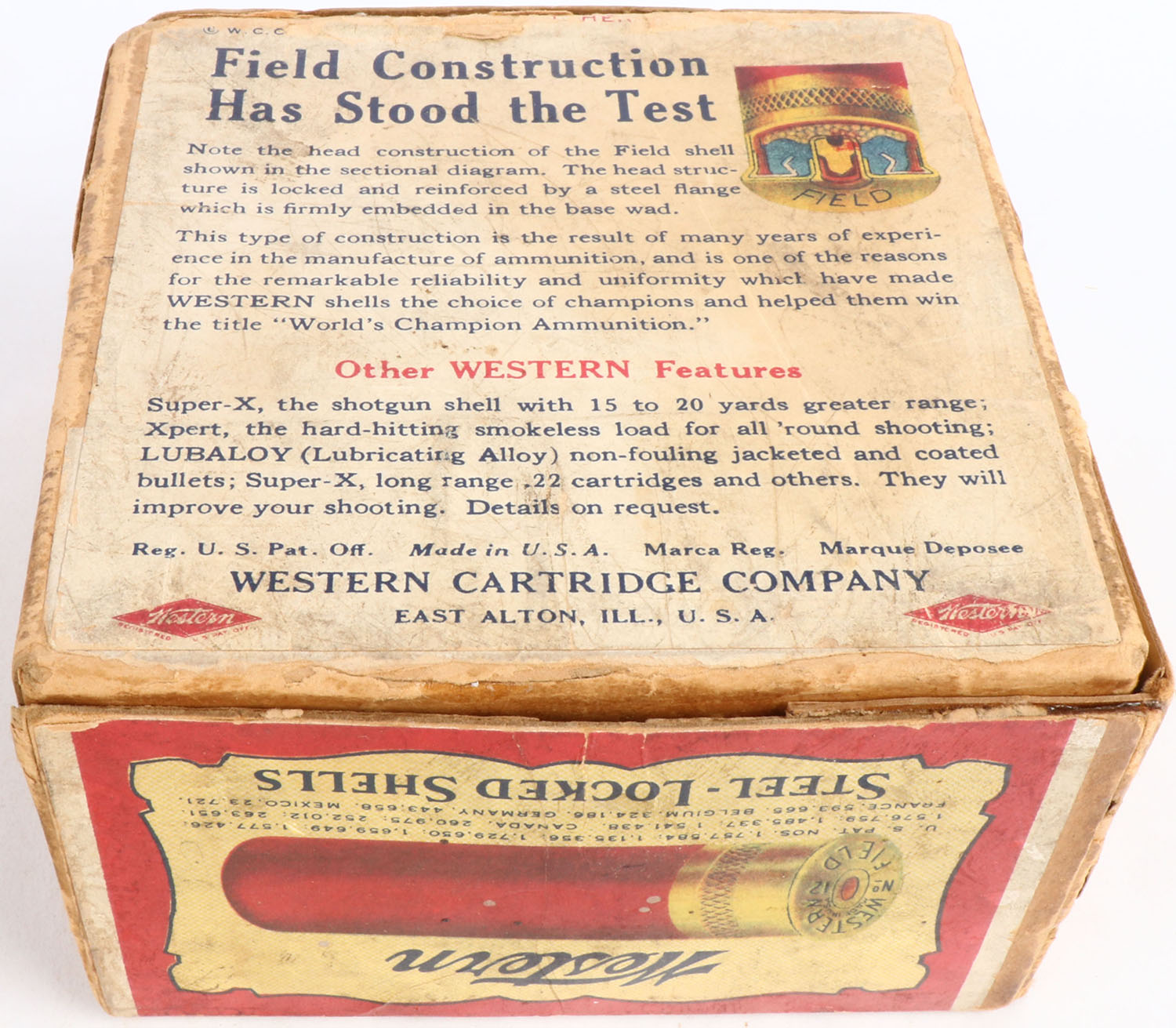 Western, Field, 12ga., 2pc., Empty, shot size 6 Ch Thicket Load, box has soiling, scuffing, tears & glue repair with very nice label. Grade: Very Good ++ - Value: 60 to 200