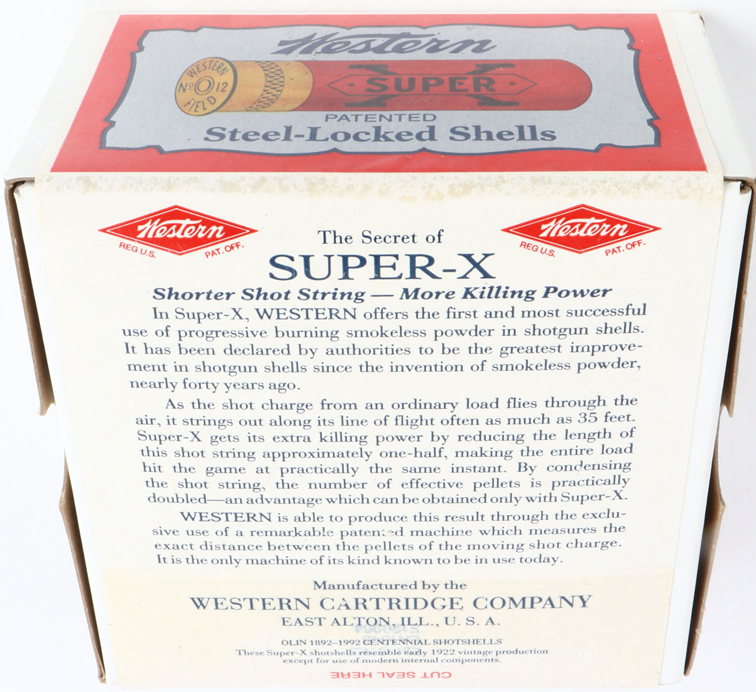 Western, Super-X, 12ga., 2pc., FULL & SEALED, shot size 6 Chilled Shot, 2 3/4'', white box with multi colored label, box & label are great, Circa 1990's. Grade: Excellent ++ - Value: 30 to 80