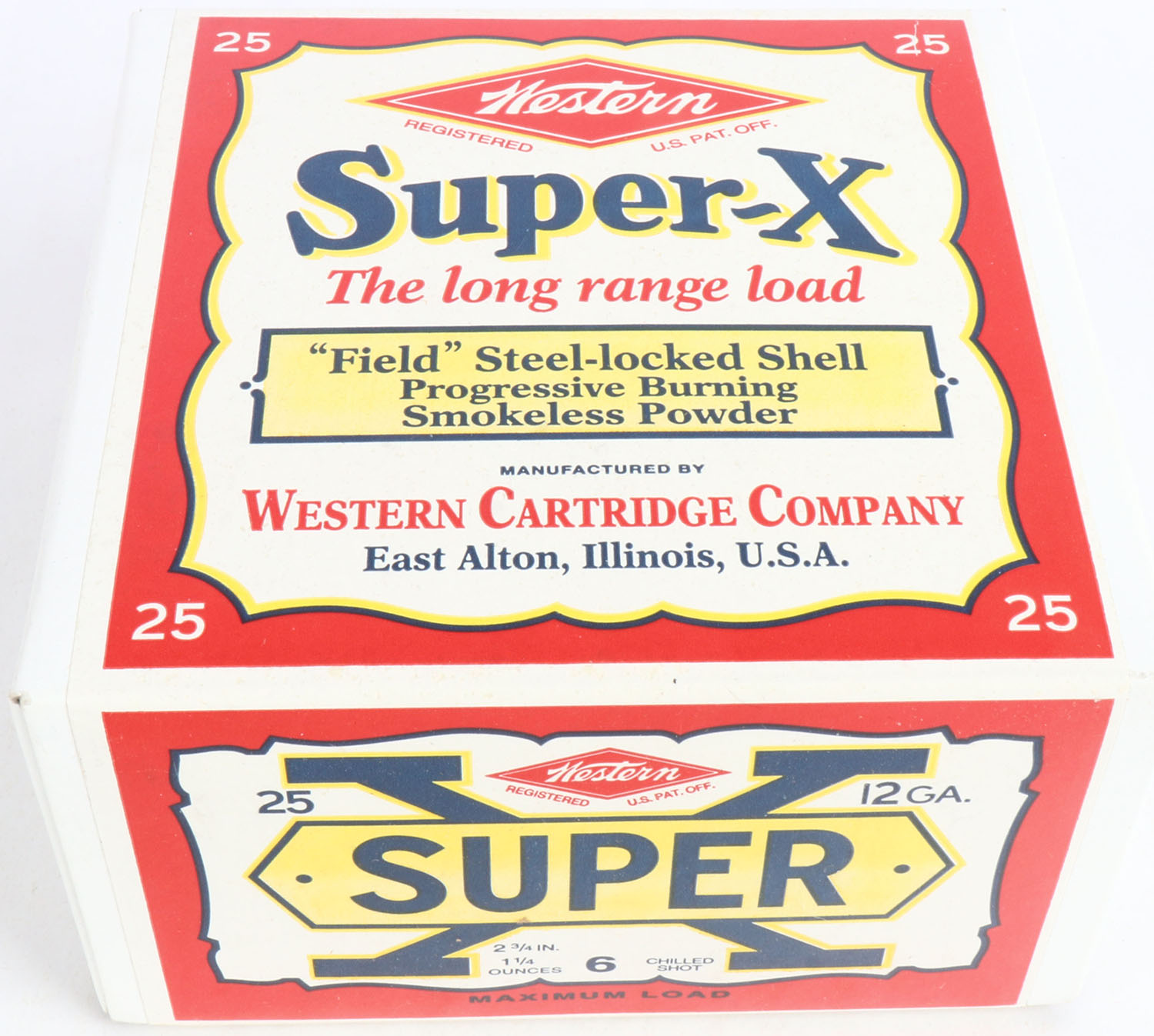 Western, Super-X, 12ga., 2pc., FULL & SEALED, shot size 6 Chilled Shot, 2 3/4'', white box with multi colored label, box & label are great, Circa 1990's. Grade: Excellent ++ - Value: 30 to 80
