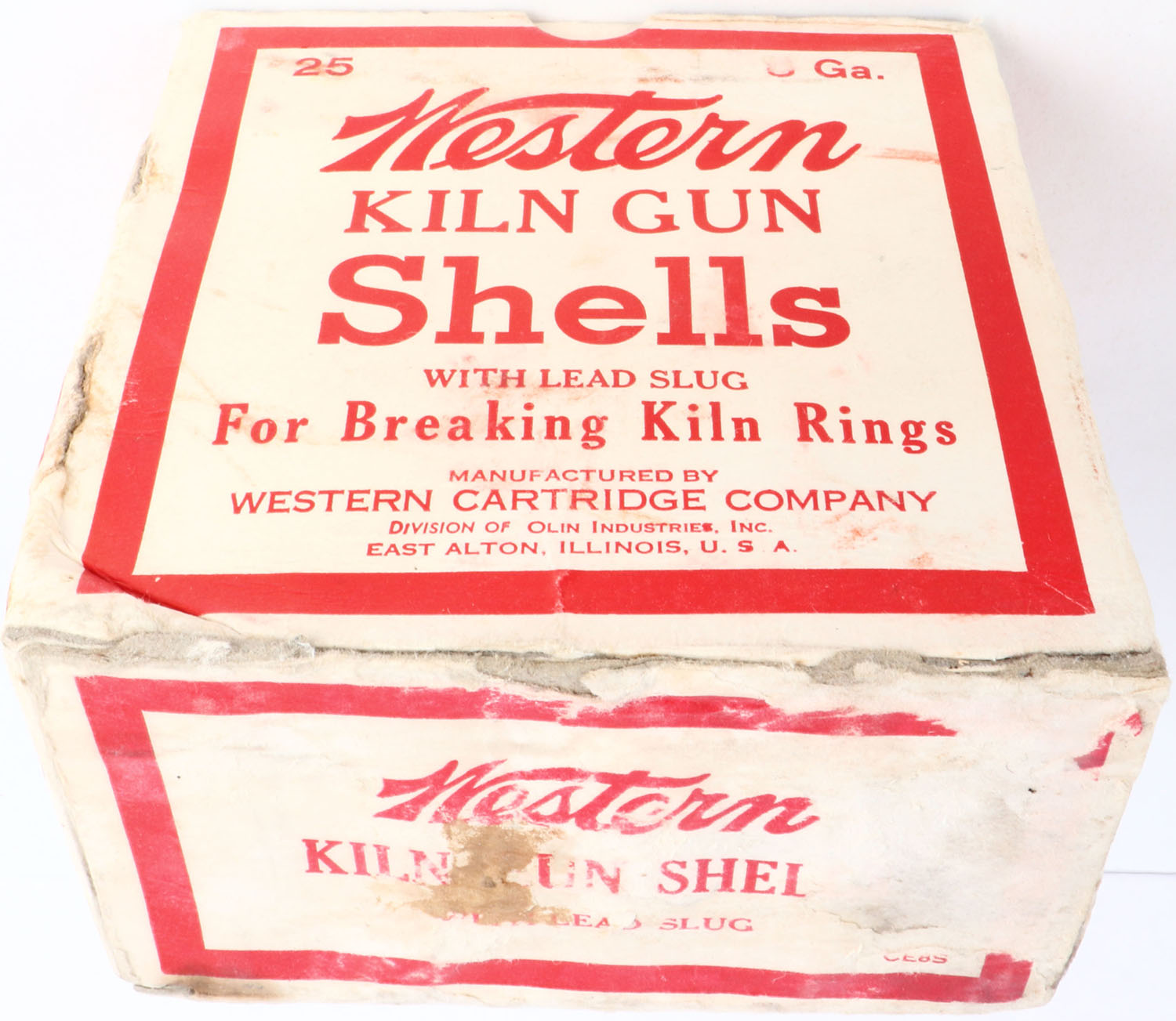 Western, Kiln Gun Shells, 8ga., 3'', 1pc., Full, shot size Lead Slug, cream & red box, box is solid with nice colors, box shows scuffing, shell protrusions & light edge wear, shells are good. Grade: Very Good ++ - Value: 40 to 150