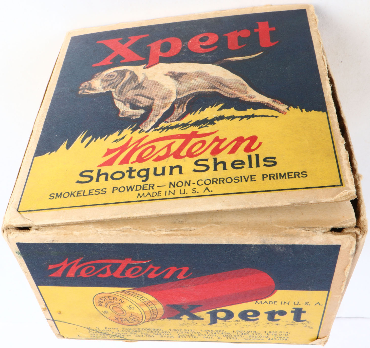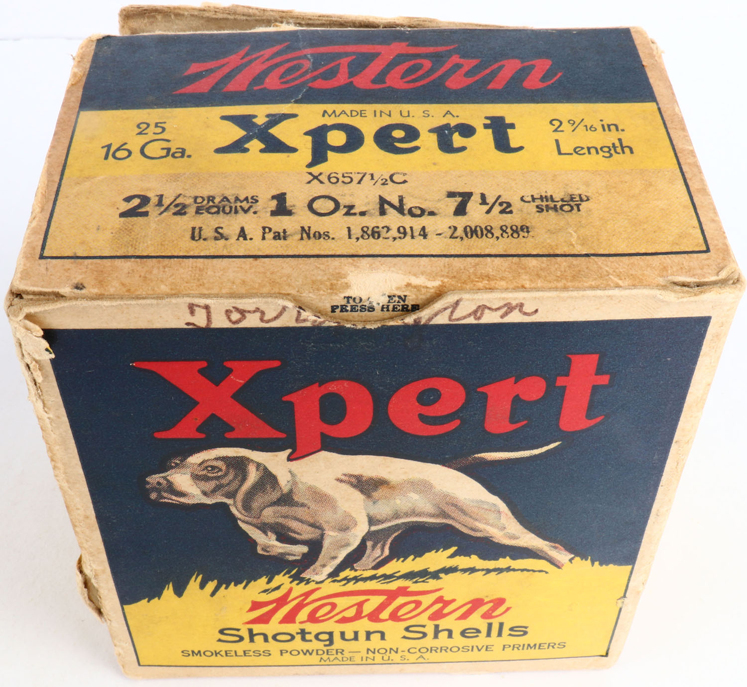 Western, Xpert, 16ga., 1pc., Partial 22rds, blue, yellow & red box with a dog on point, No. 7 1/2 Chilled Shot, box has seam split, disconnected top flap, light soiling, & light edge wear with great colors, Shells are excellent. Grade: Very Good ++ - Value: 20 to 60
