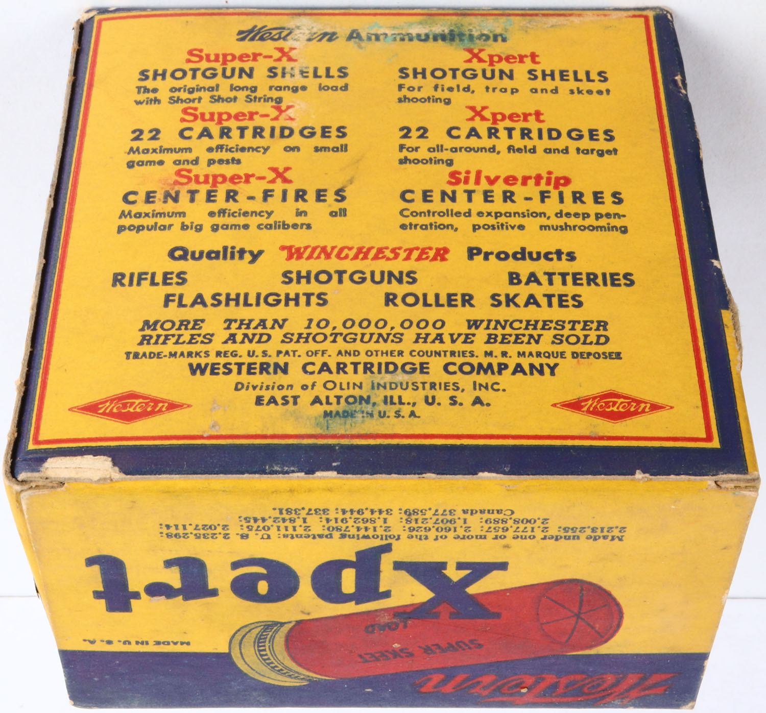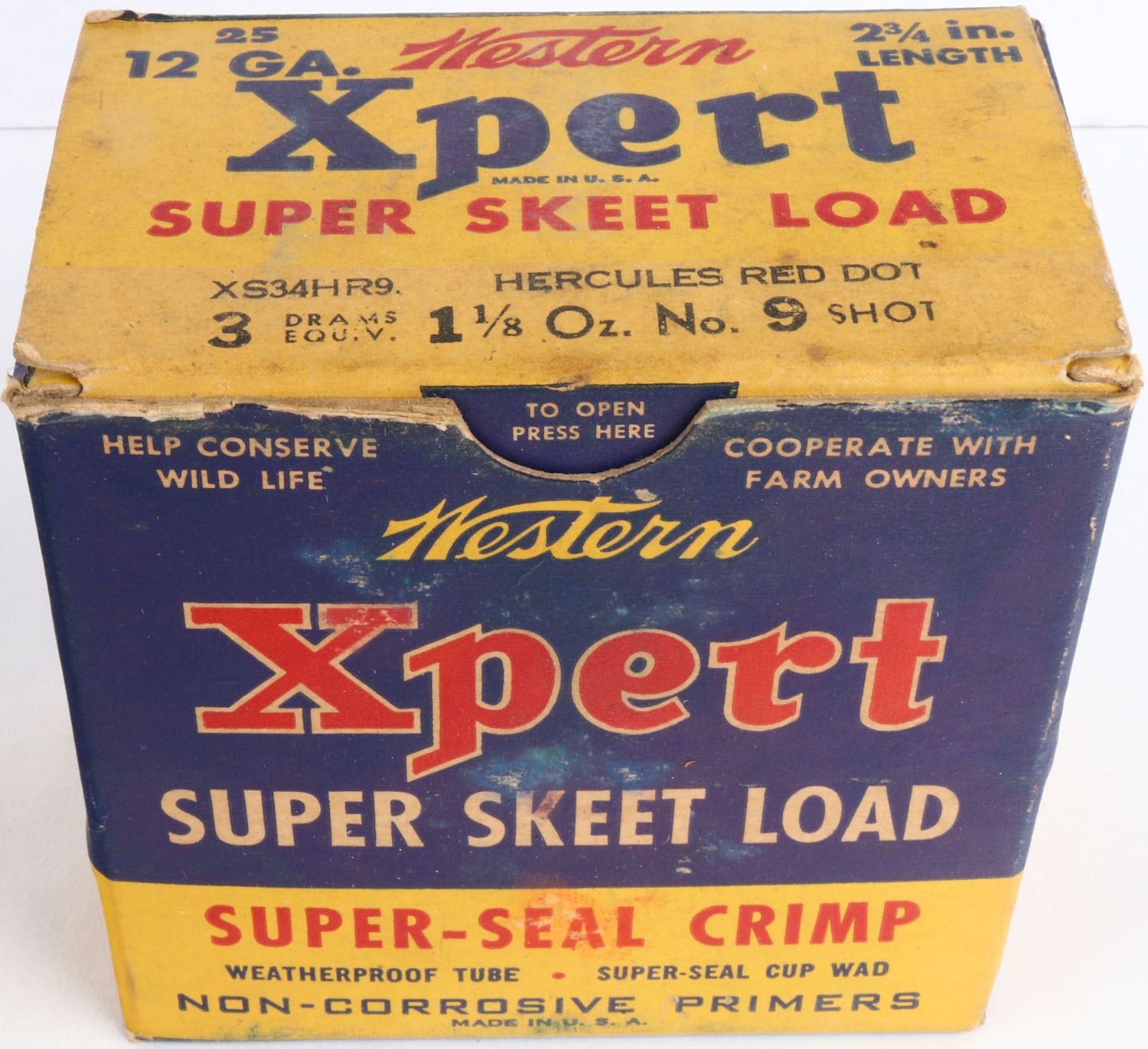 Western, Xpert Super Skeet Load, 12ga., 2 3/4'', 1pc., Partial 19rds., shot size 9 Hercules Red Dot, multi-colored box, box is solid with light soiling, small shell protrusion, box has very nice colors, shells are excellent. Grade: Very Good ++ - Value: 10 to 30