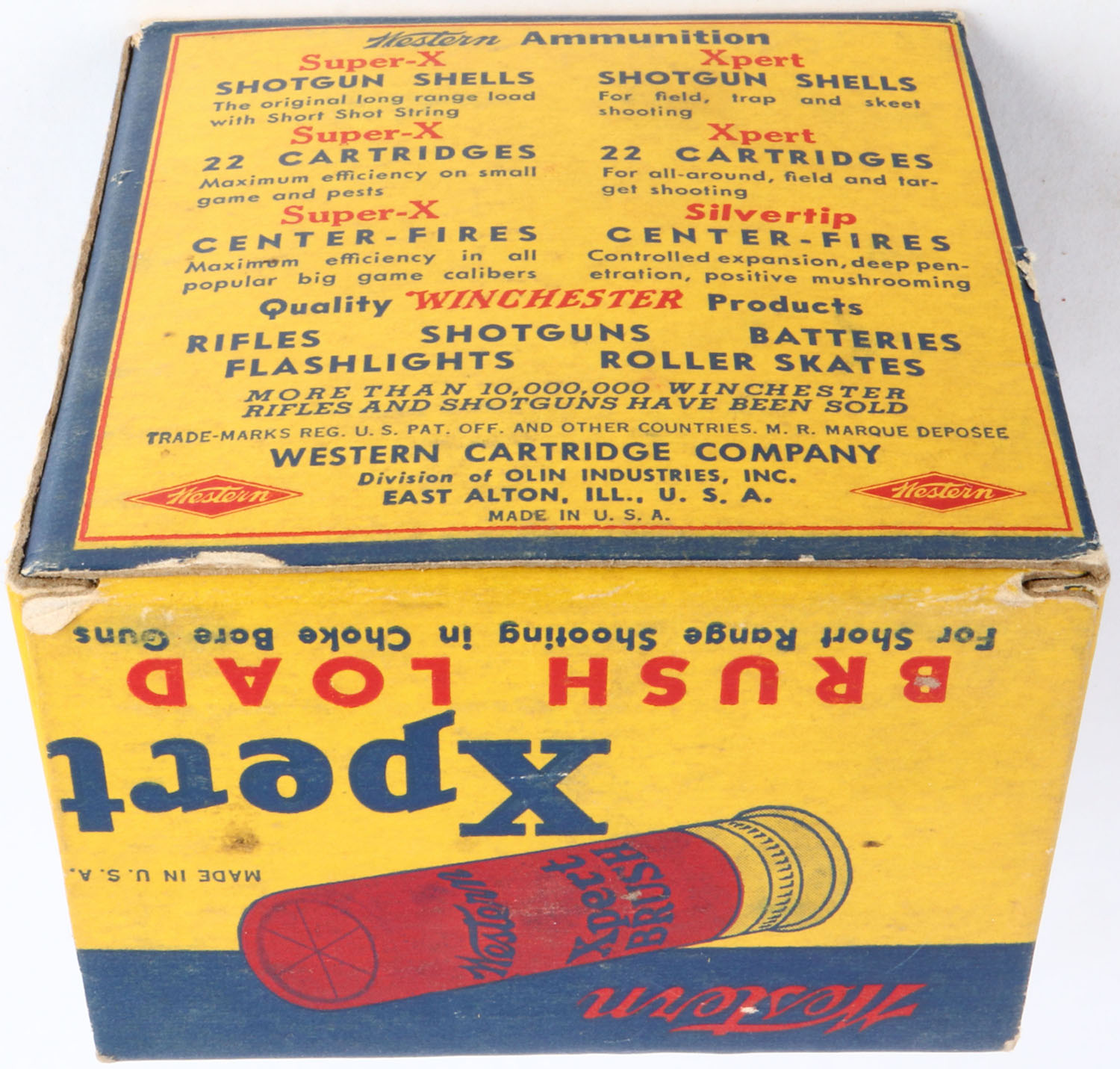 Western Xpert Brush Load, 20ga., 1pc., Partial 20rds., shot size 8, 2 3/4'', multi-colored box, box has light edge wear & great color, shells are excellent. Grade: Excellent - Value: 10 to 30