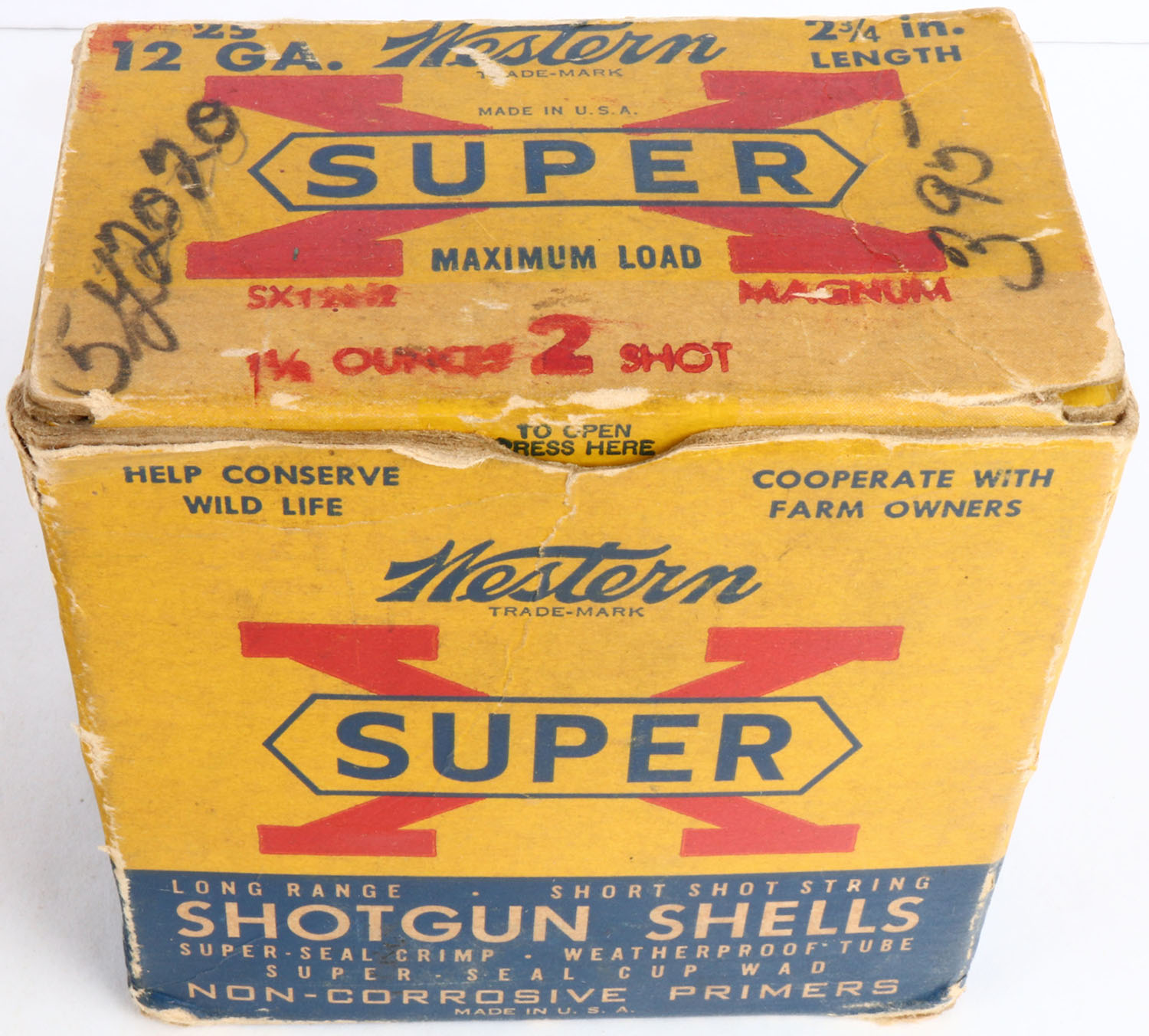 Western, Super X, 12ga., 3'', 1pc., Partial 21rds. With one being incorrect shot size, shot size 2 Magnum, multi-colored box, box is solid with edge wear & light age soiling, box has very nice colors, shells are excellent. Grade: Very Good ++ - Value: 10 to 30