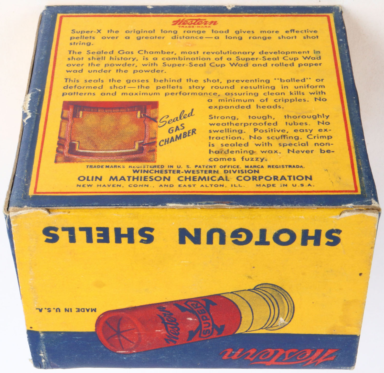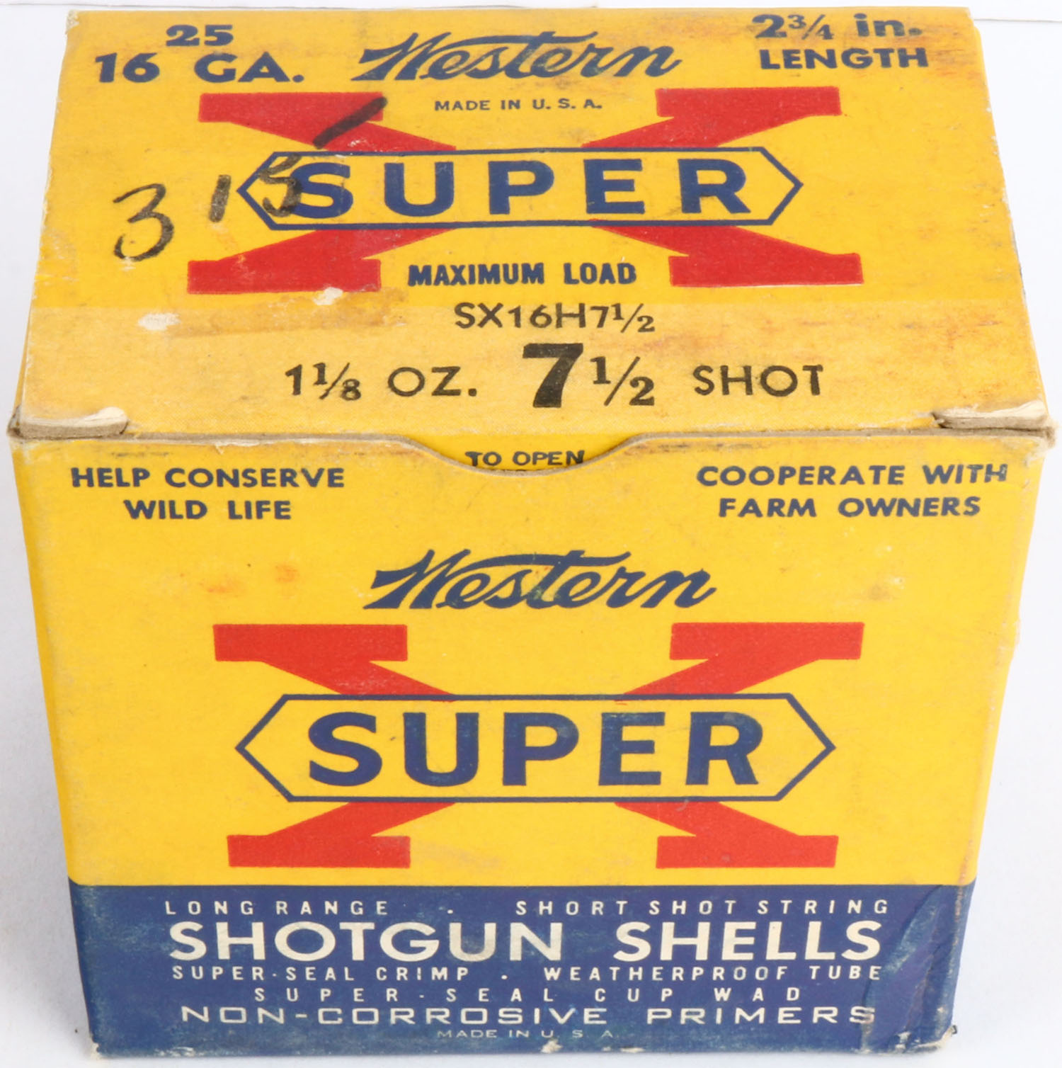 Western, Super X, 16ga., 2 3/4'', 1pc., Full, shot size 7 1/2, multi-colored box, box is solid with light soiling, box has great colors, shells are excellent. Grade: Excellent - Value: 10 to 30