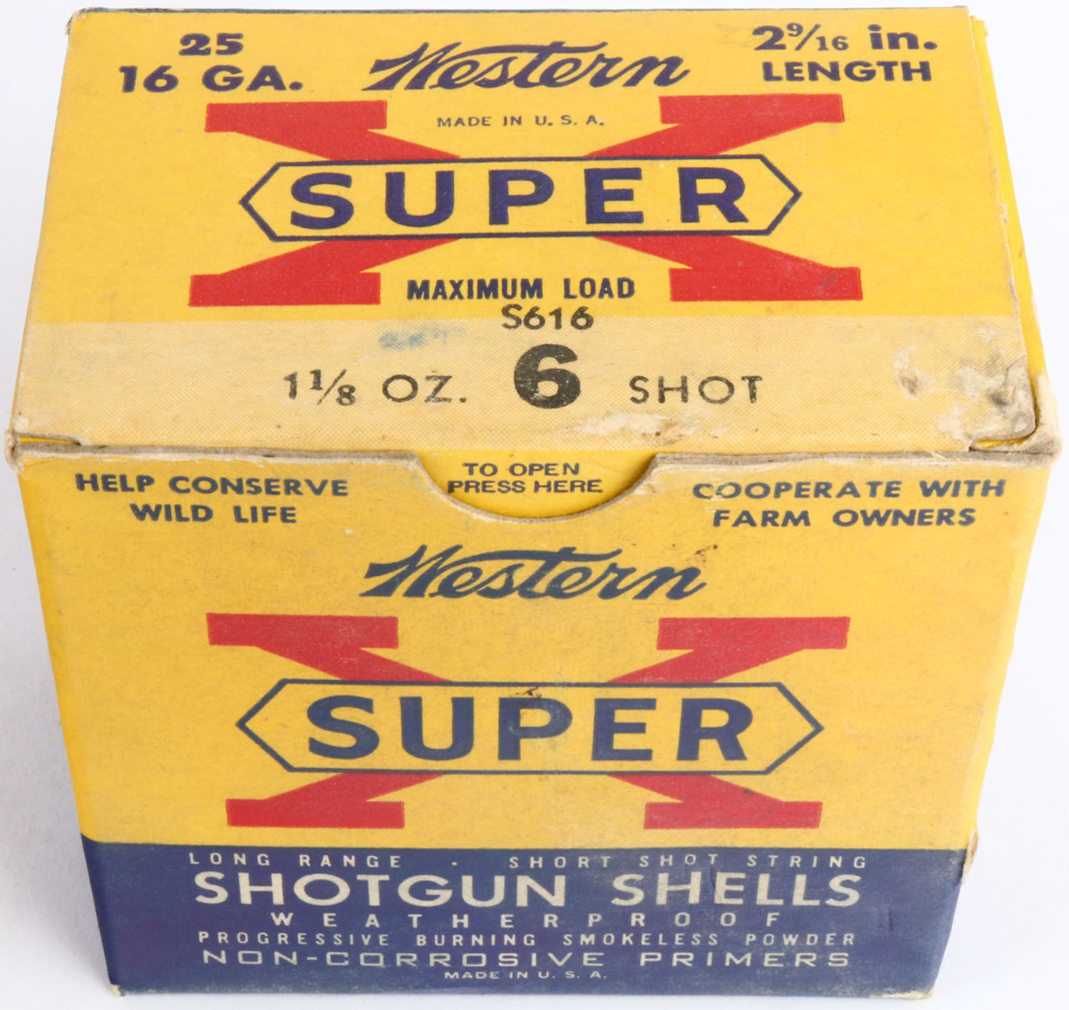 Western, Super X, 16ga., 2 9/16'', 1pc., Full, shot size 6, multi-colored box, box is solid with light soiling, box has great colors, shells are excellent. Grade: Excellent - Value: 10 to 30