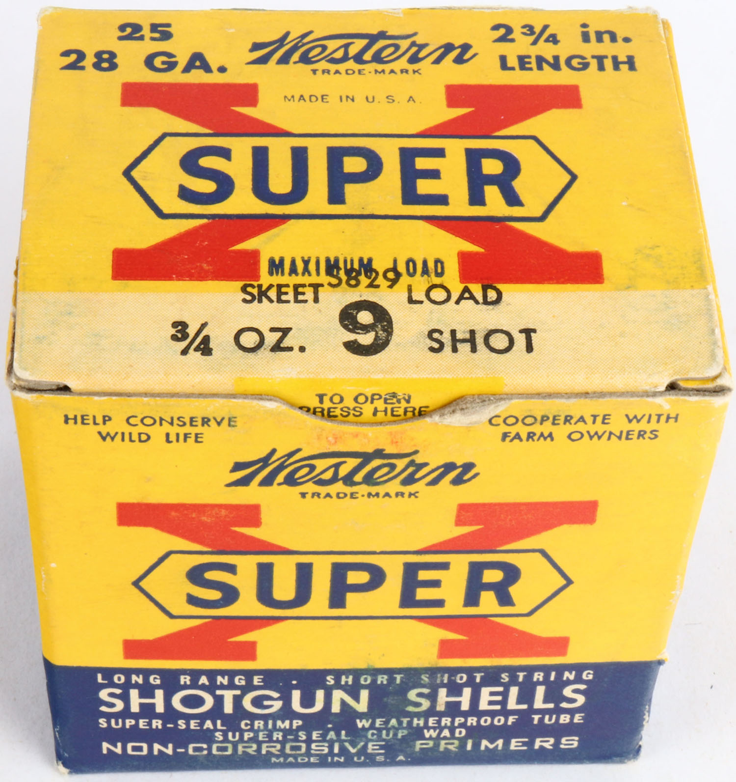 Western, Super X, 28ga., 2 3/4'', 1pc., Full, shot size 9 Skeet Load, multi-colored box, box is solid with light soiling, box has great colors, shells are excellent. Grade: Excellent + - Value: 10 to 30