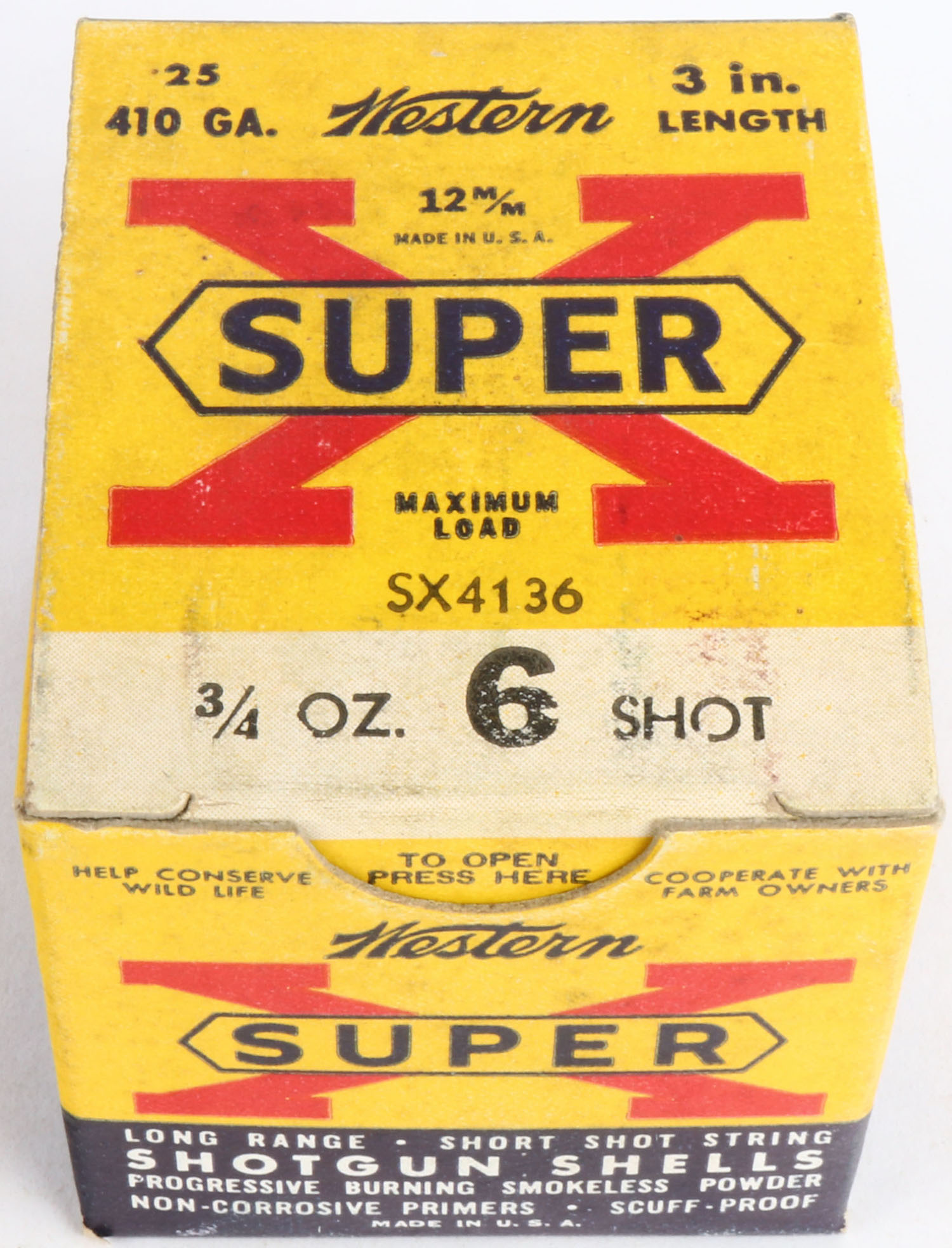 Western, Super X with insert, 410ga., 3'', 1pc., Full, shot size 6, multi-colored box, box is very solid with great colors, shells are excellent. Grade: Excellent + - Value: 10 to 30
