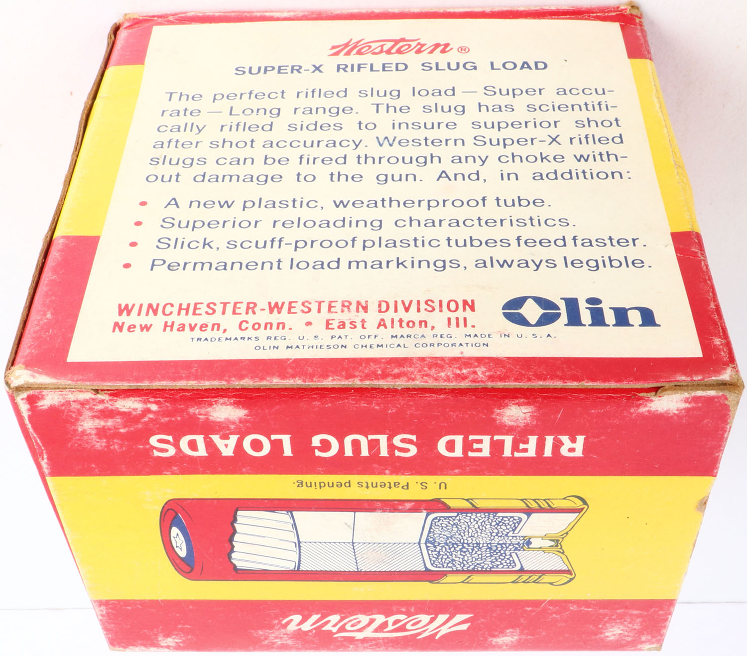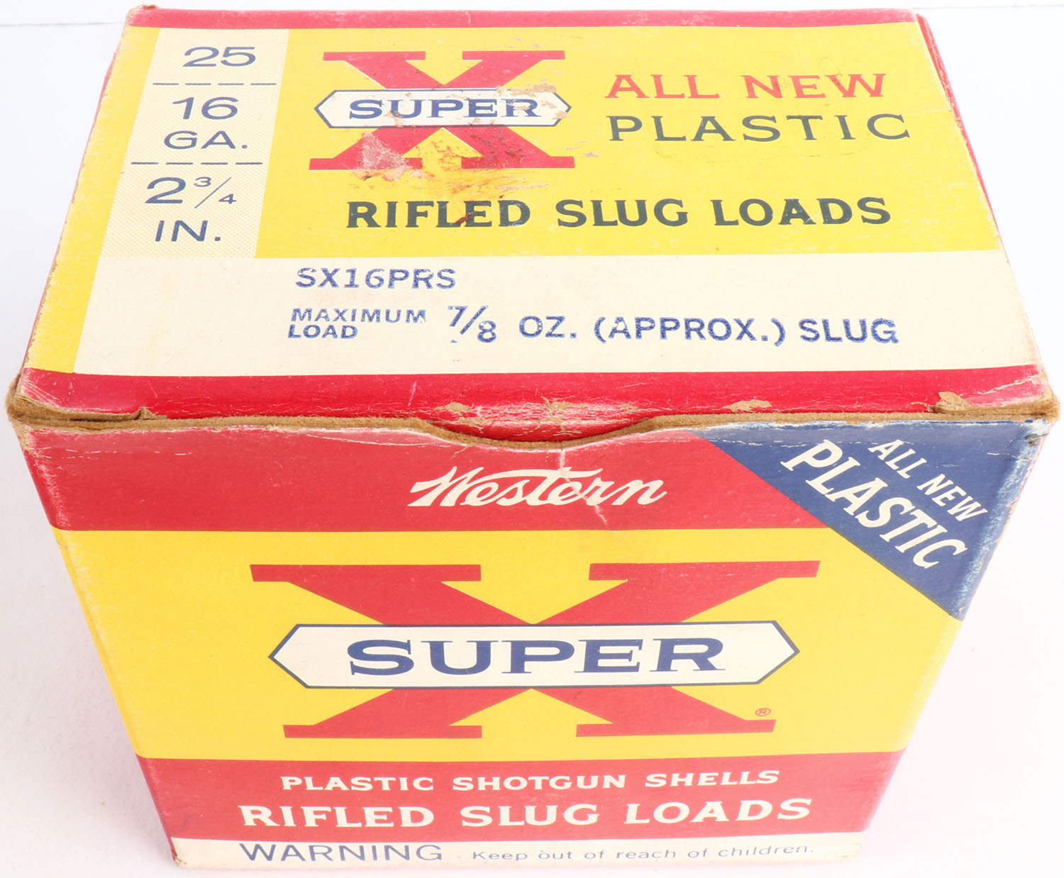 Western, Super X, 16ga., 2 3/4'', 1pc., Partial 24rds., shot size Rifled Slugs, multi-colored box, box is solid with light scuffing, box has great colors, shells are excellent. Grade: Excellent - Value: 10 to 40