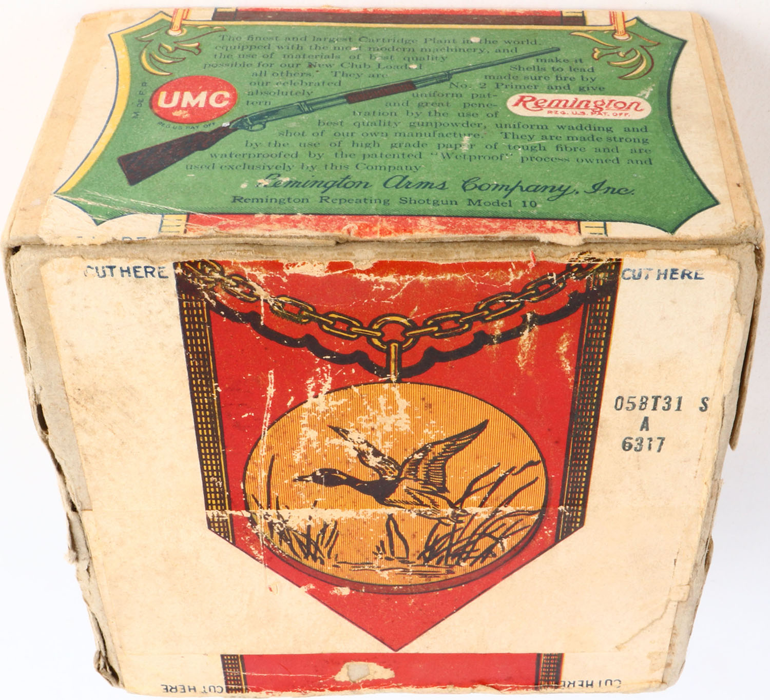 REM-UMC, New Club, 12ga, 2pc., Full with 8rds being correct shot size, shot size 6, buff box with green, yellow, blue & red paper label, with great colors to label box has small shell protrusions, Shells are poor. Grade: Excellent - Value: 30 to 150