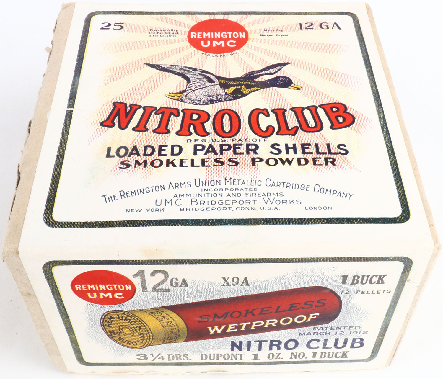 REM UMC, Nitro Club, 12ga., 2pc., FULL and Half SEALED, shot size 1 Buck, buff box with sunburst logo & Mallard flying on top, box has great colors with seam splits. Grade: Excellent - Value: 100 to 300