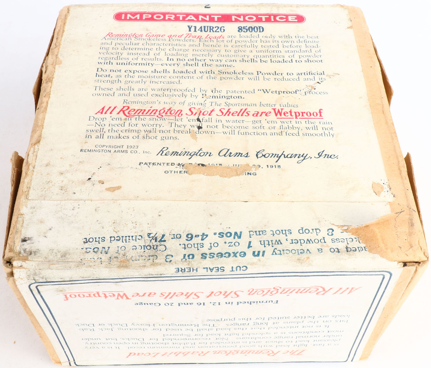 Remington UMC Nitro Club, GAME LOADS, RABBIT LOAD, 12ga., 2pc., FULL & SEALED, shot size 6 CH, buff box with sunburst logo & RABBIT on side, box has light soiling, light scuffing & seam splits with great label. Grade: Excellent - Value: 100 to 400