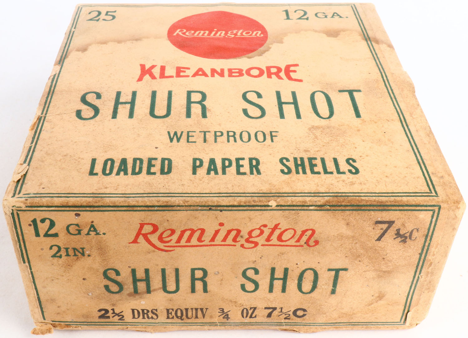 Remington, SHUR SHOT, 12ga., 2'', 2pc., FULL & SEALED, shot size 7 1/2 C, Buff box with buff, green & red paper label, label is 85% intact, box is solid with soiling & very nice colors. Grade: Excellent - Value: 80 to 300