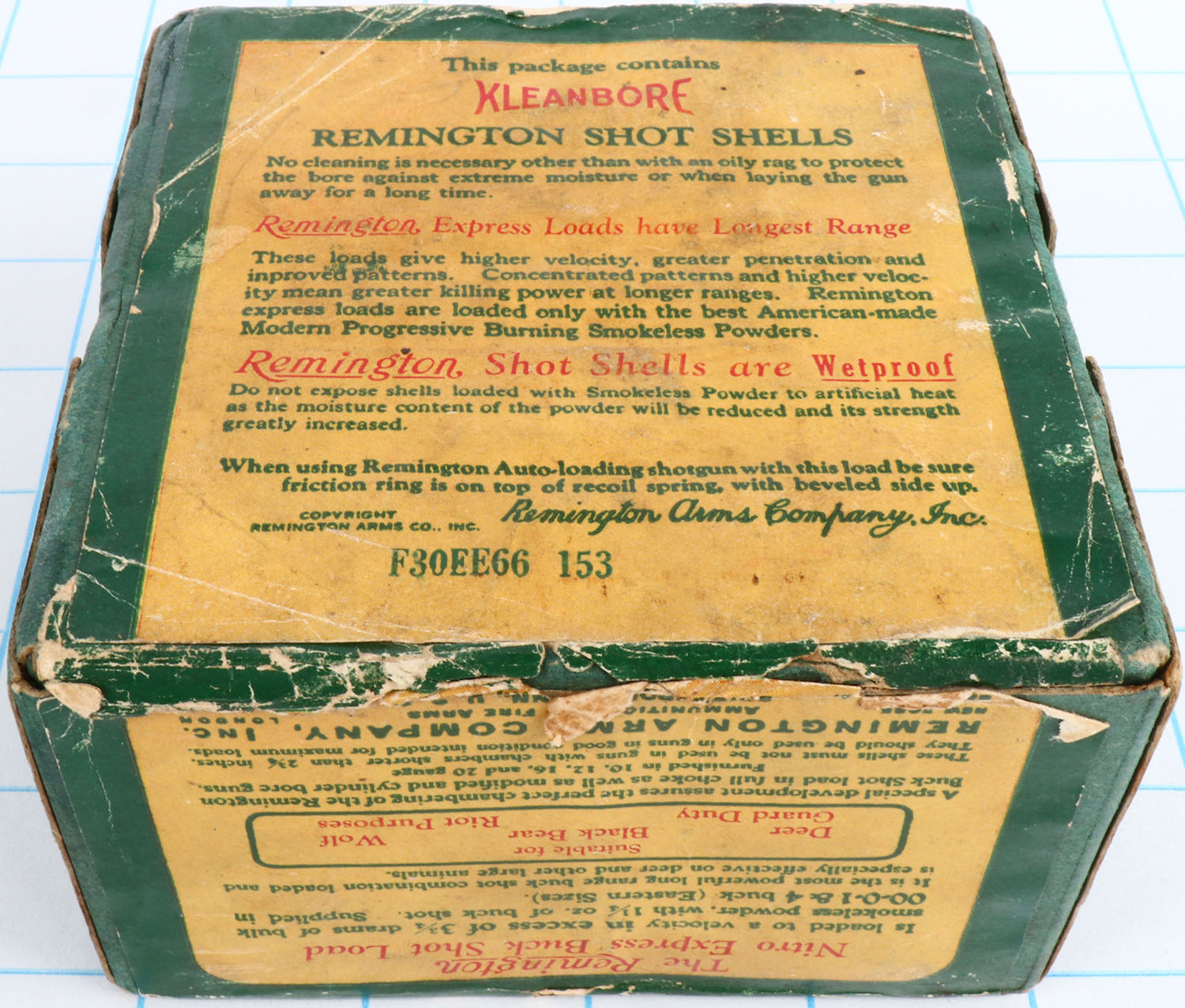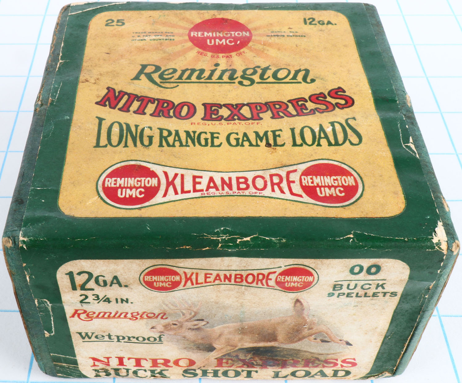 Remington UMC Nitro Express, Long Range Game Loads, pictures Buck jumping, 12ga., 2pc., Empty, shot size 00 BUCK, green box with sunburst logo & BUCK on side, box is solid with light soiling, light edge wear & very nice colors. Grade: Excellent - Value: 50 to 200