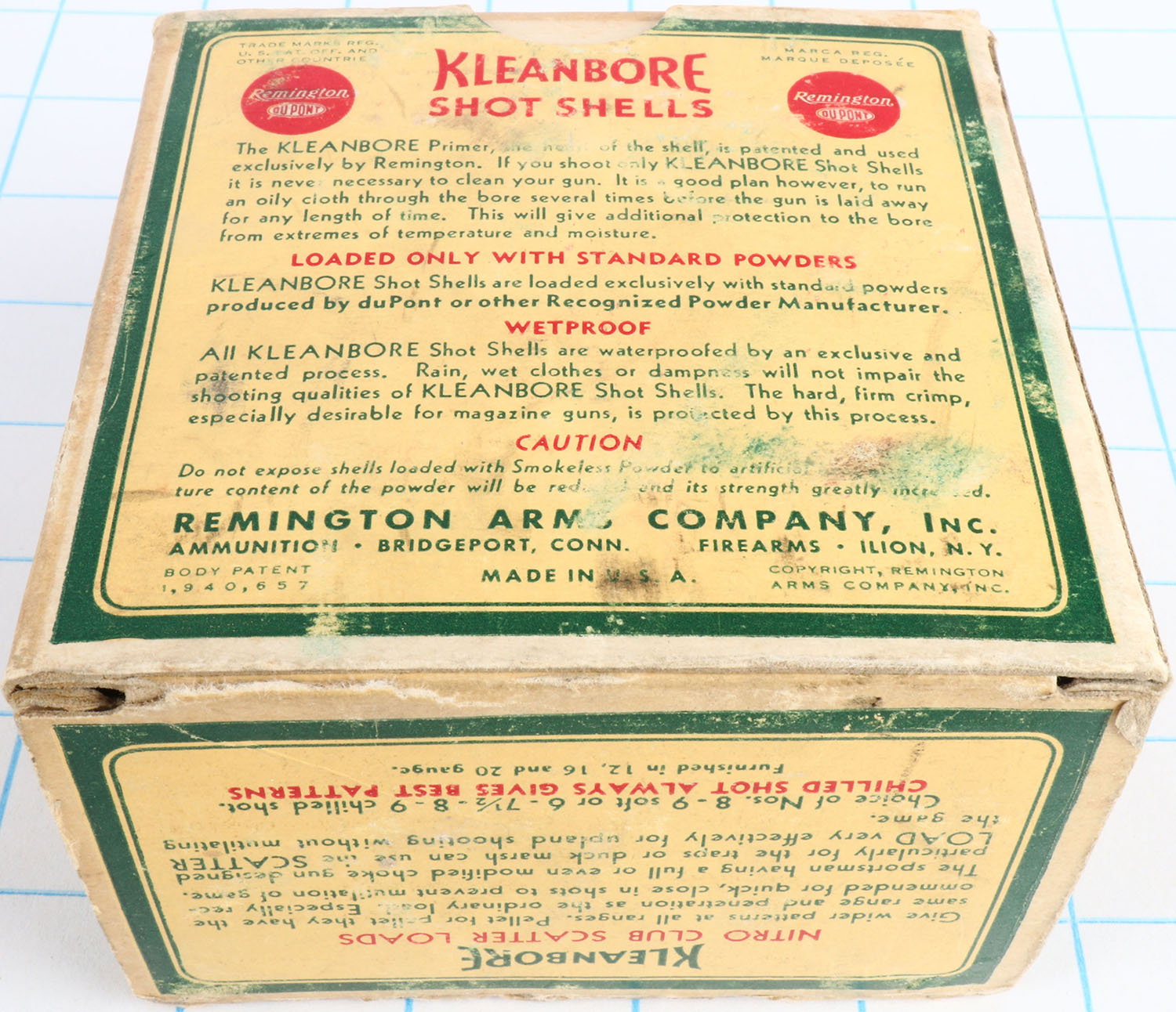 Remington Kleanbore, NITRO CLUB Scatter Loads, with insert, 16ga., 2 1/2'', 1pc., Partial 22rds., shot size 9, box is yellow, red and green, box has light edge wear, glue repair & light scuffing with very nice colors, shells are excellent. Grade: Excellent - Value: 20 to 60