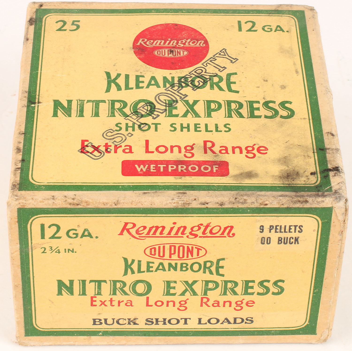 Remington Kleanbore, US PROPERTY, NITRO EXPRESS, 1pc., Full, shot size 00 BUCK Shot Loads, box is yellow, red and green, box is solid with soiling, shells are excellent. Grade: Very Good + - Value: 10 to 60