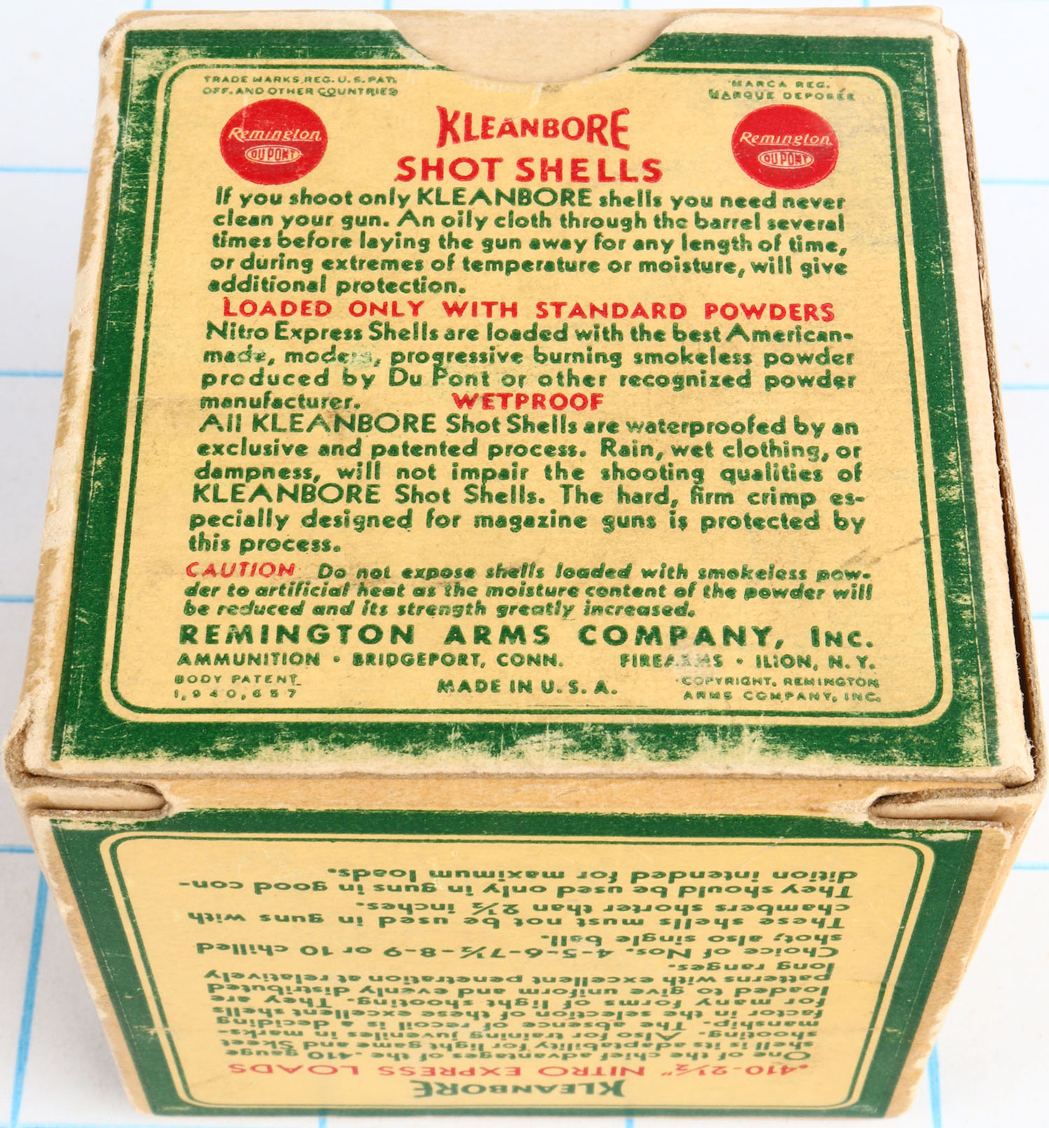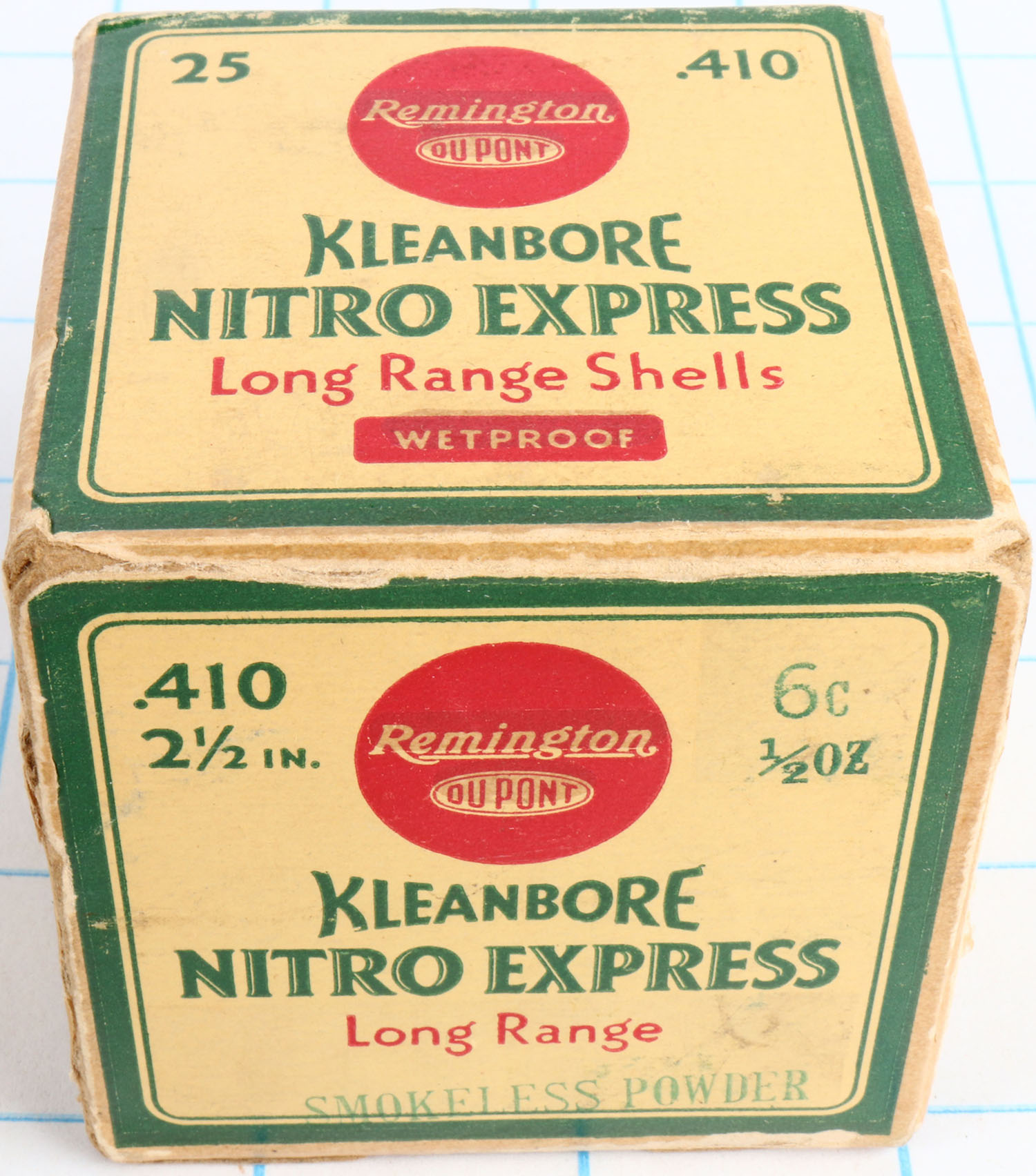 Remington Kleanbore, NITRO EXPRESS, 410ga., 2 1/2'', 1pc., Full, shot size 6 C, box is yellow, red and green, box has light edge wear with great colors, Shells are excellent. Grade: Excellent - Value: 10 to 50