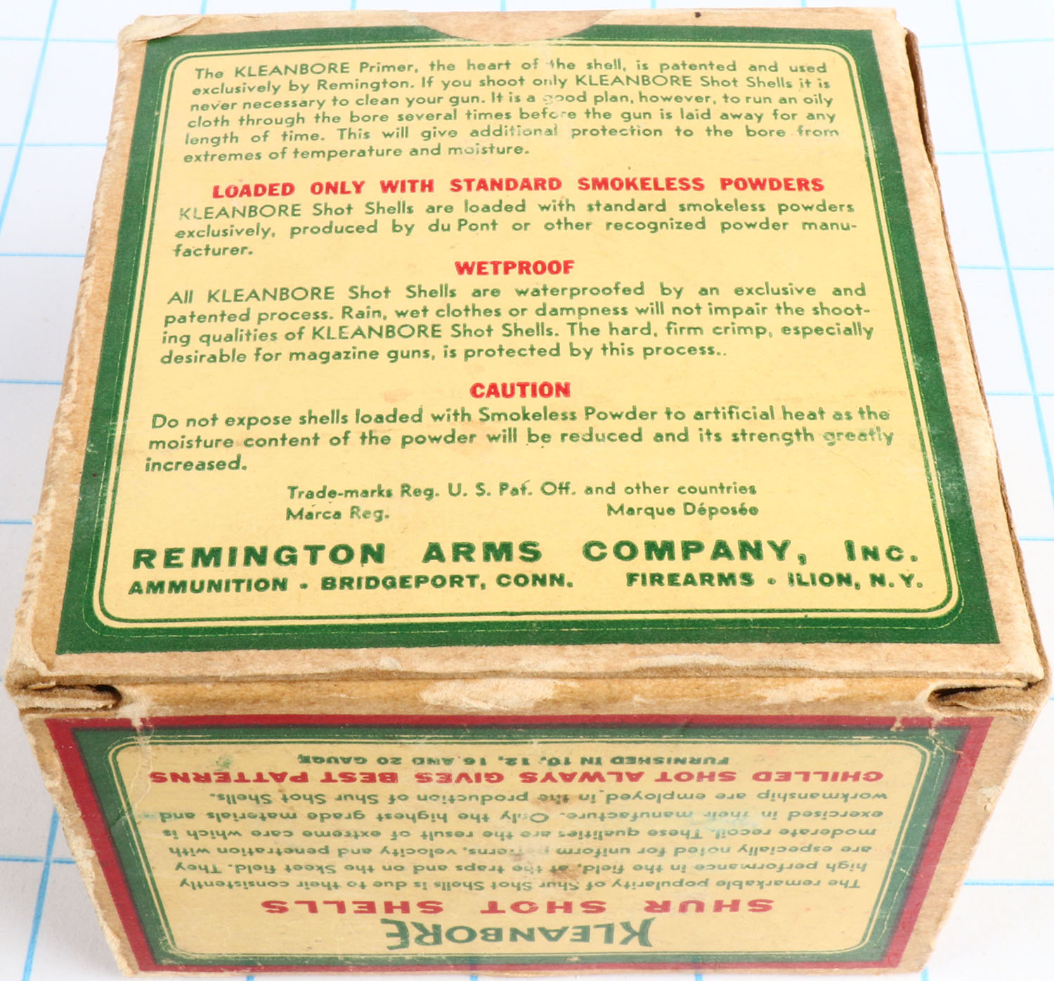 Remington Kleanbore, SHUR SHOT SHELLS, 20ga., 2 1/2'', 1pc., Full, shot size 7 1/2 C, box is yellow, red and green, box has light edge wear & light soiling with great colors, Shells are excellent. Grade: Excellent - Value: 10 to 50