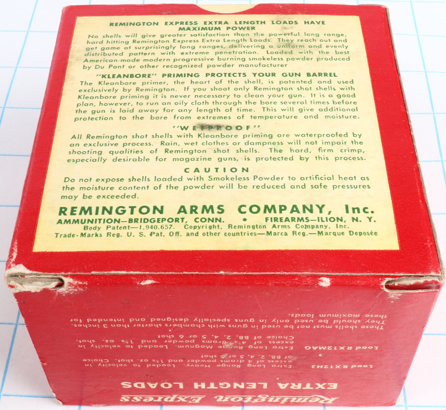 Remington, Express Extra Length, 12ga., 1pc., Full with 24rds being correct shot size, shot size 4 Magnum, red and green box, 3'', box is very solid with great colors, shells are excellent. Grade: Excellent ++ - Value: 10 to 50
