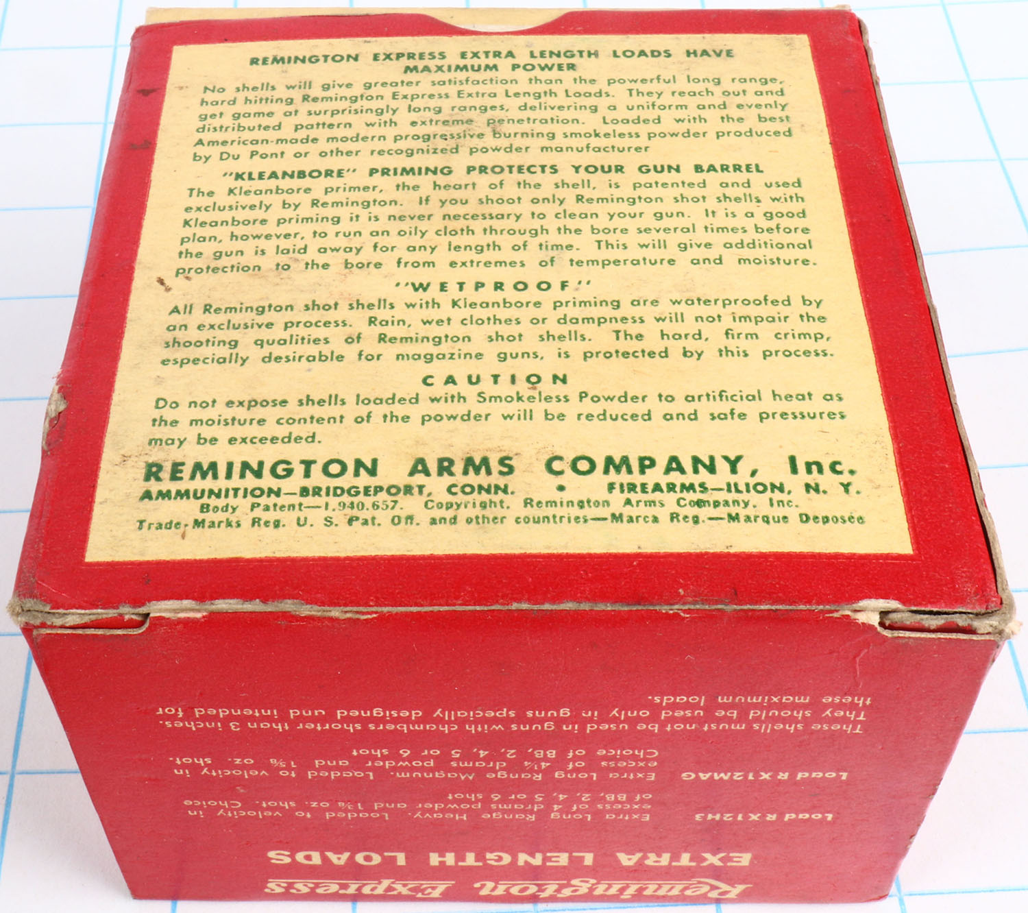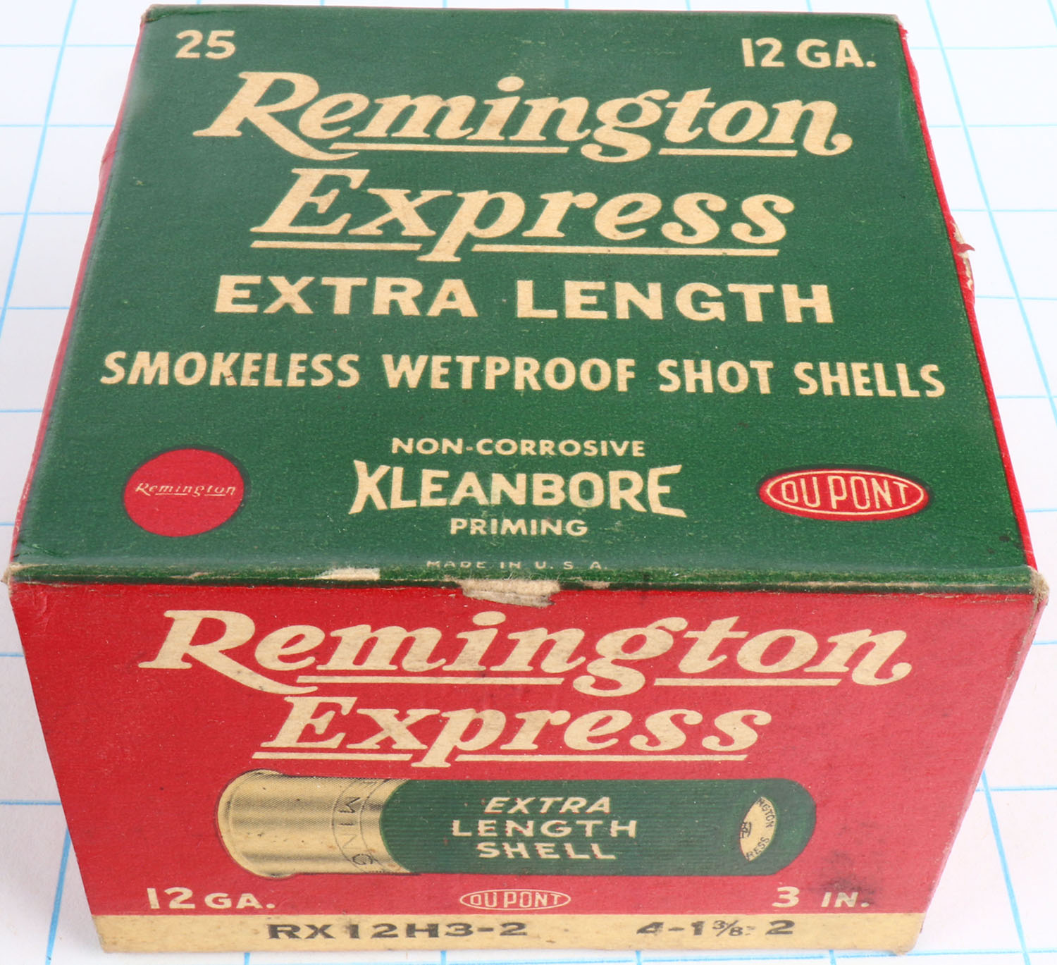 Remington, Express Extra Length, 12ga., 1pc., Full, shot size 2, red and green box, 3'', box is very solid with light edge wear, shells are very good. Grade: Excellent + - Value: 10 to 50