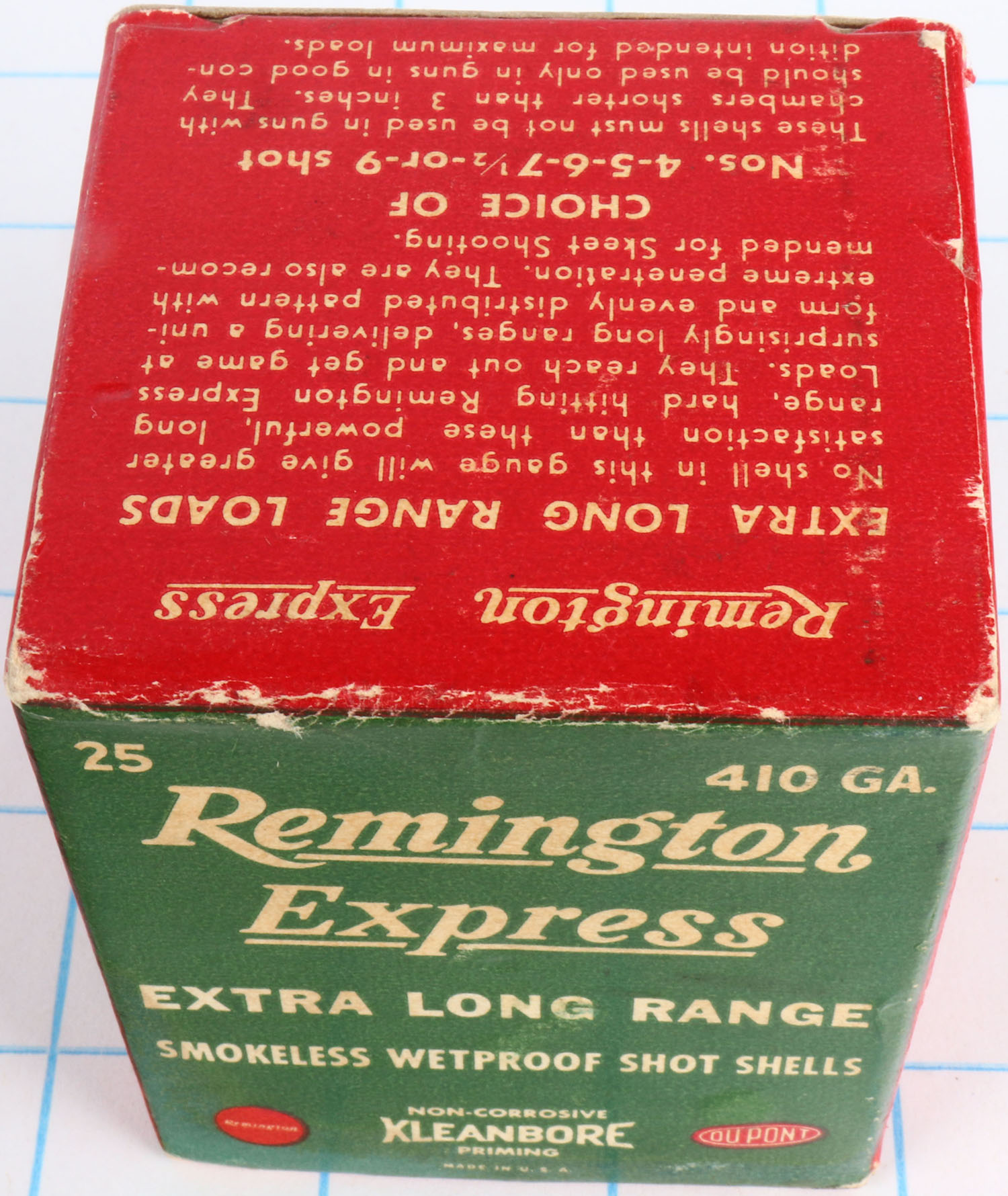 Remington Express, Extra Long Range, 410ga., 1pc., Partial 24rds with 1rd having different primer, shot size 7 1/2, red, white and green box, 3'', box bottom inside flap is torn with great colors, shells are excellent. Grade: Excellent - Value: 10 to 40