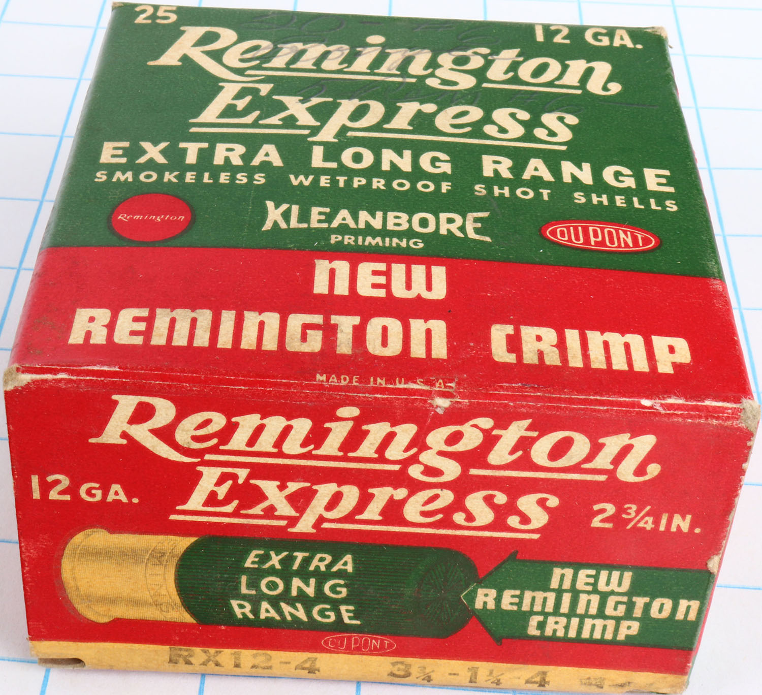 Remington Express, Extra Long Range, 12ga., 2 3/4'', 1pc., Partial 4rds all incorrect shot size, shot size 4, box is red, white and green, box is solid with light soiling & great colors, shells are excellent. Grade: Excellent - Value: 10 to 20