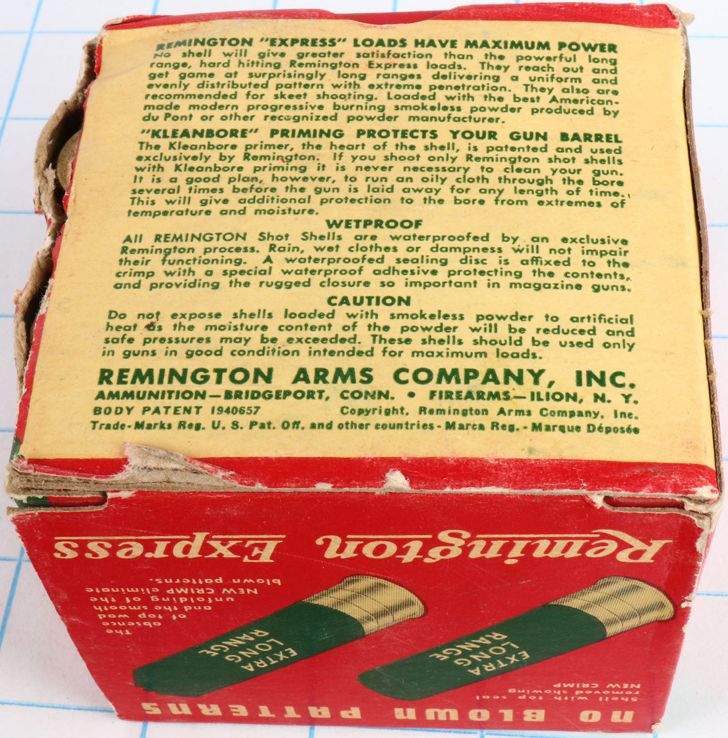 Remington Express, Extra Long Range, 28ga., 2 3/4'', 1pc., Full, shot size 4, red and green box, box has shell protrusions & great colors, shells are excellent. Grade: Very Good ++ - Value: 10 to 30