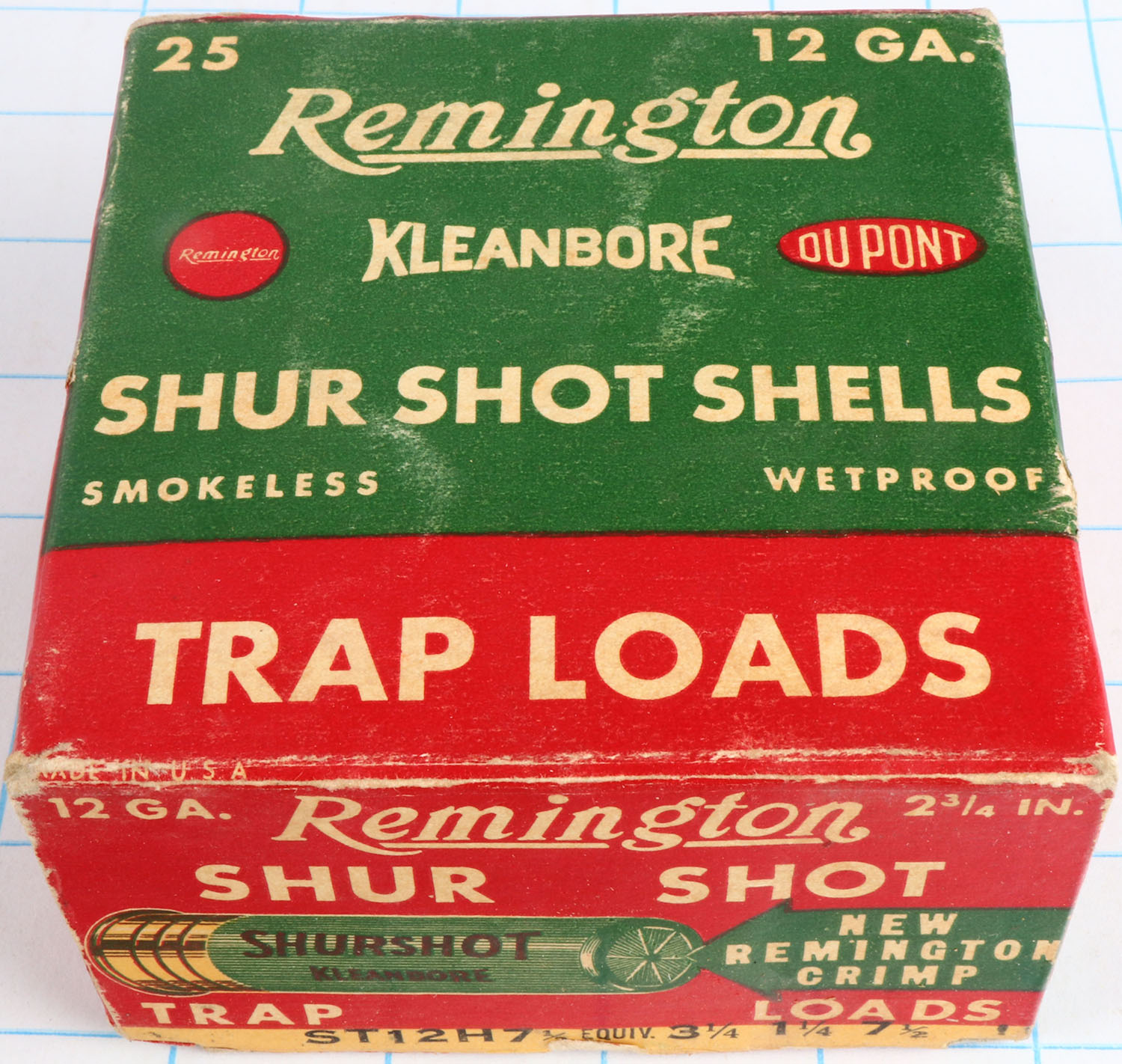 Remington Shur Shot Shells, Trap Loads, 12ga., 1pc., Full, shot size 7 1/2, red and green box, 2 3/4'', box is solid with light edge wear & great colors, shells are excellent. Grade: Excellent - Value: 10 to 30