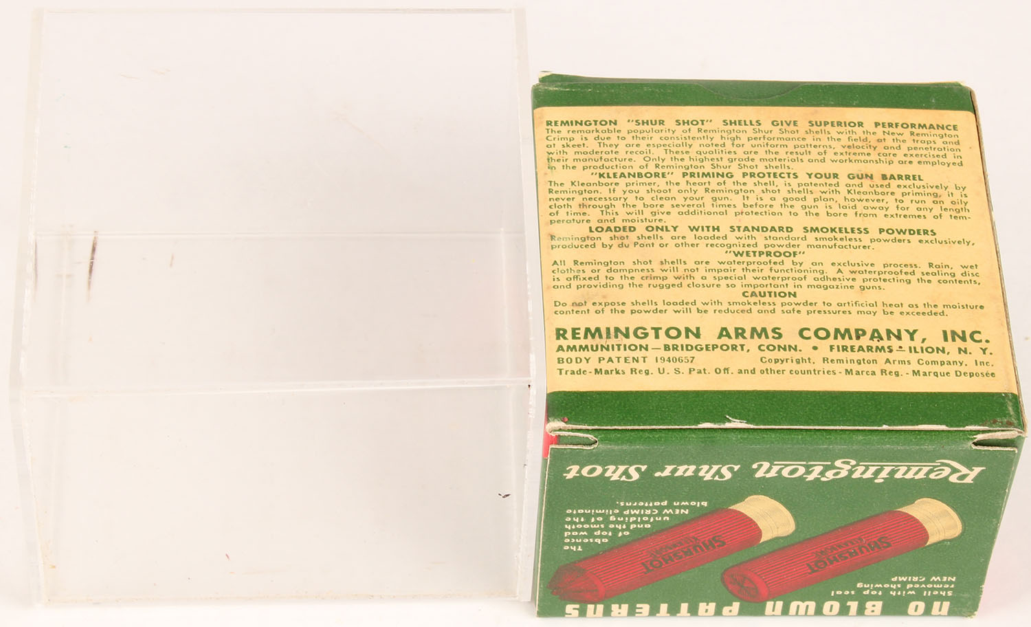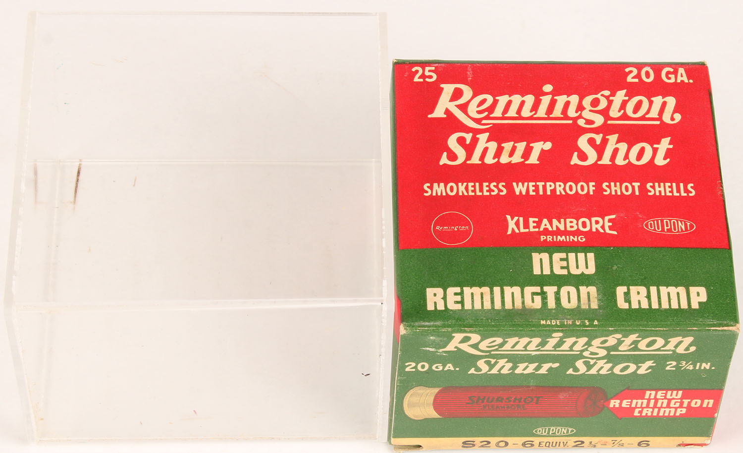 Remington Shur Shot with Acrylic Box, 20ga., 2 3/4'', 1pc., Full, shot size 6, box is red, white and green, box is solid with great colors, shells are excellent. Grade: Excellent ++ - Value: 10 to 30
