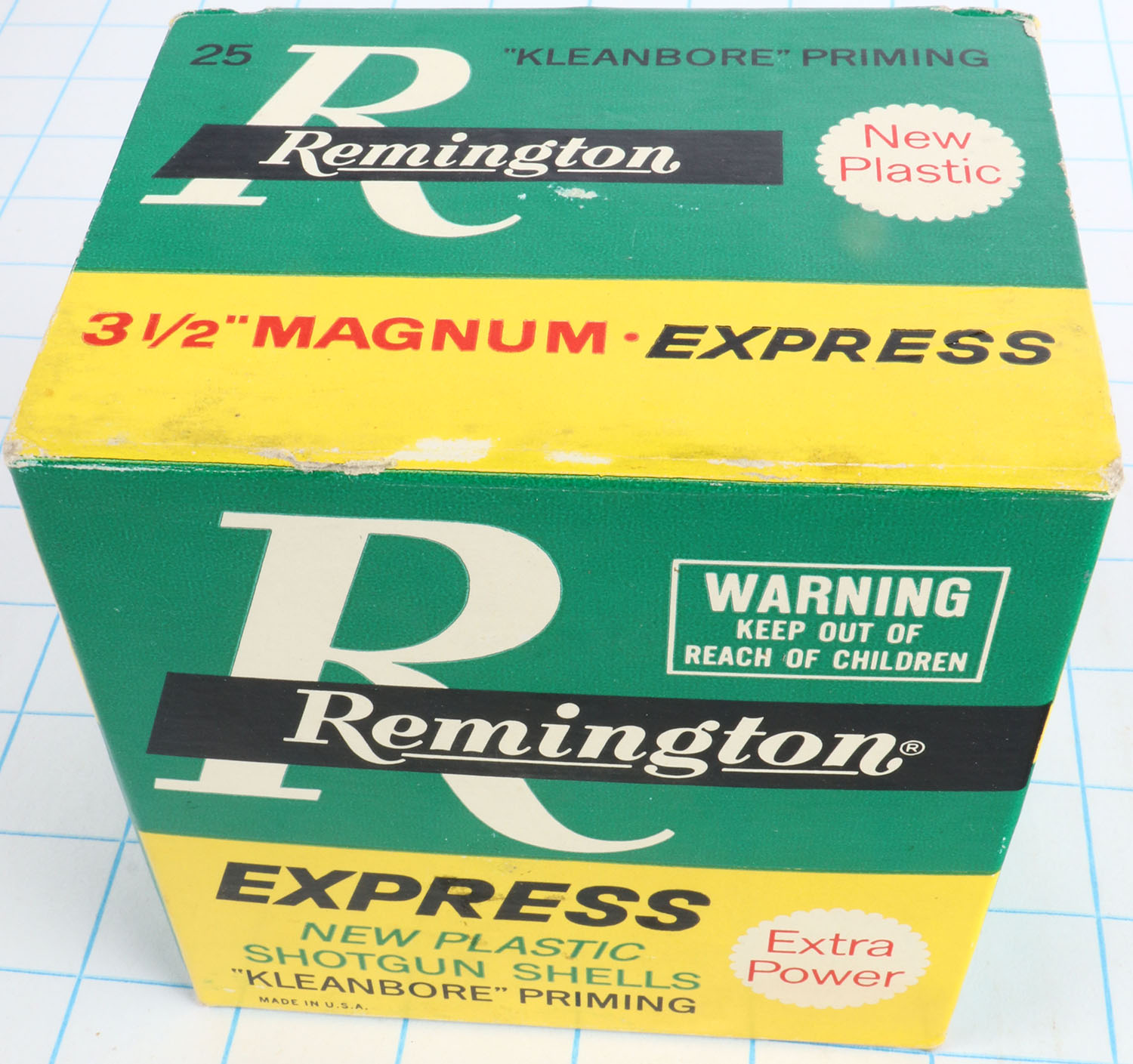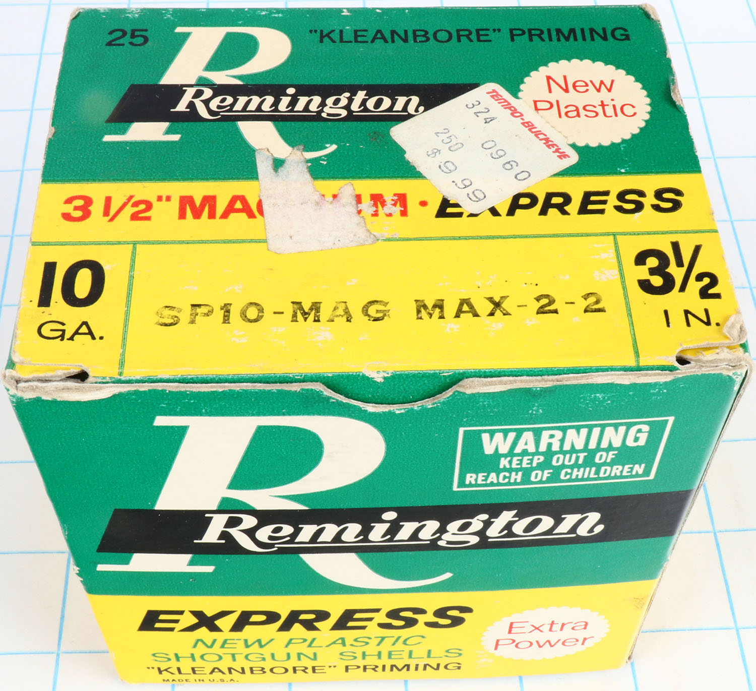 Remington, Magnum Express, 10ga., 1pc., Full, shot size 2, multi-colored box, shells are excellent. Grade: Excellent - Value: 10 to 40