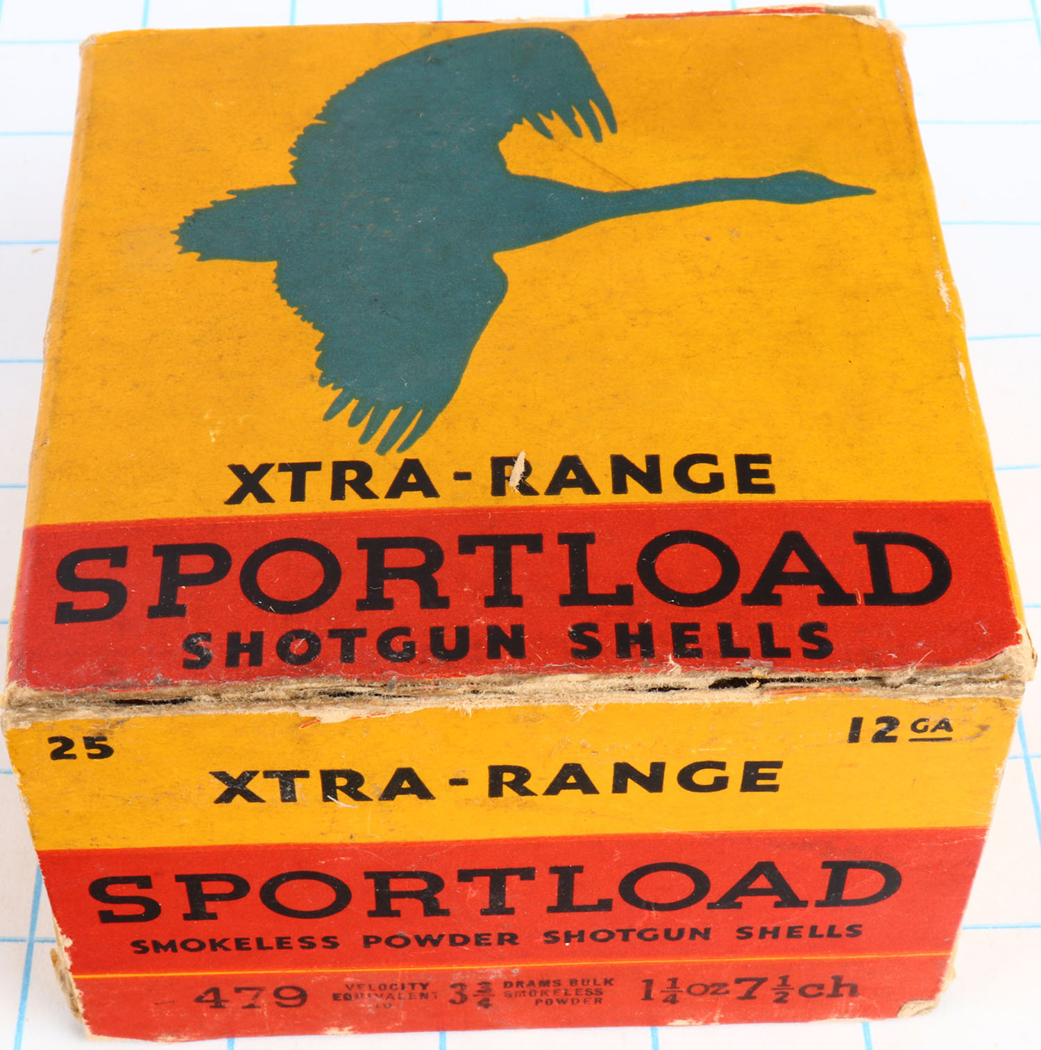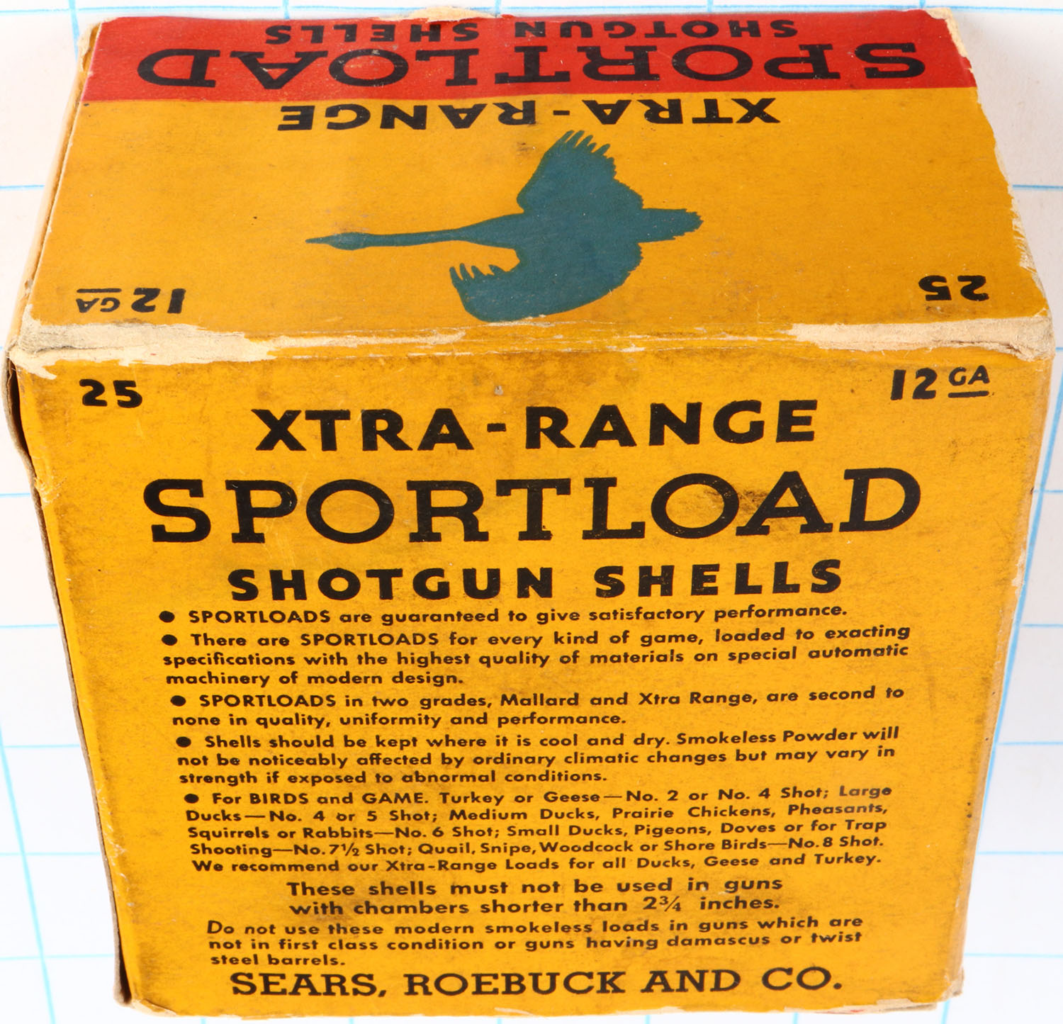Sears, Sportload XTRA-RANGE, 12ga., 1pc., Partial 24rds., shot size 7 1/2 ch, yellow, red & blue box that pictures a Goose in flight, box has torn bottom flap & bottom inside flap, light edge wear & great color, Shells are excellent. Grade: Excellent - Value: 10 to 50