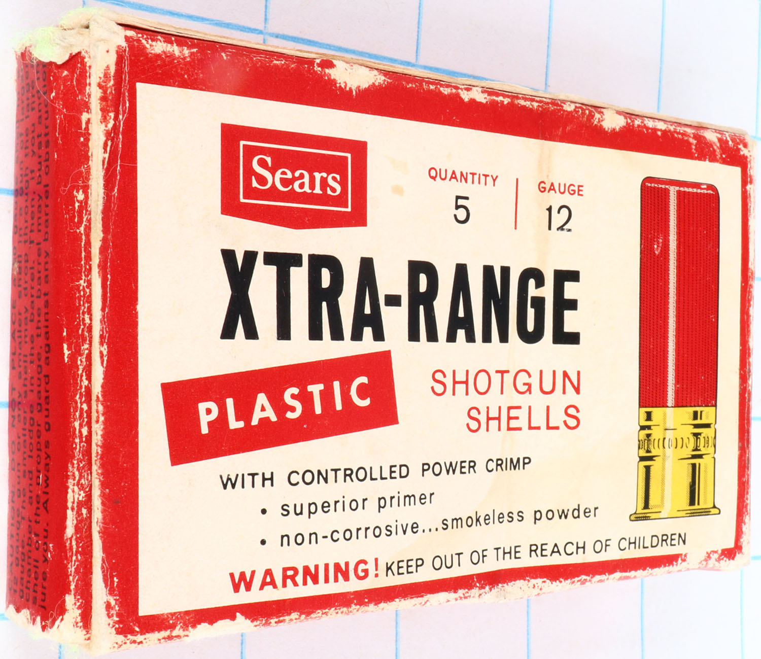 Sears, Xtra-Range, 12ga., 1pc., Partial 3rds, Shot Size 00 Buckshot Magnum, box has edge wear, light soiling & nice colors, shells are excellent. Grade: Very Good ++ - Value: 2 to 10