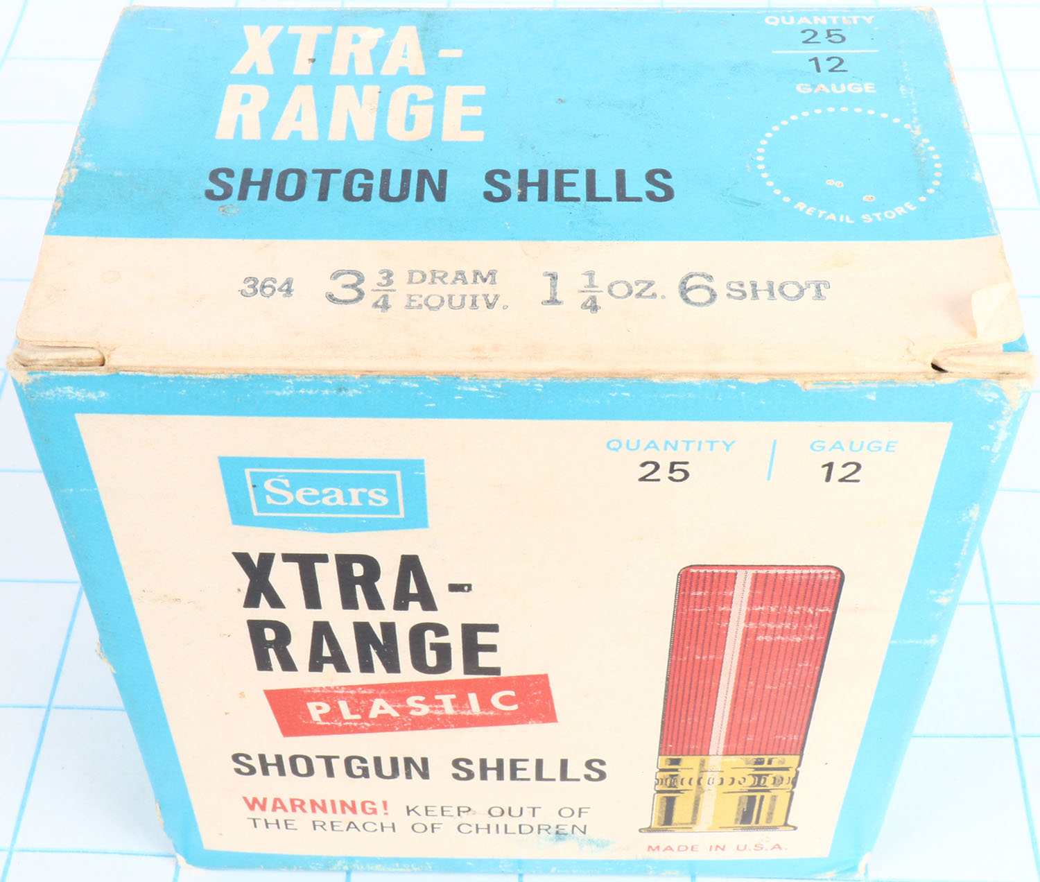 Sears, Xtra-Range, 12ga., 1pc., Full, Shot Size 6, box has light edge wear & great colors, shells are excellent. Grade: Excellent - Value: 10 to 30