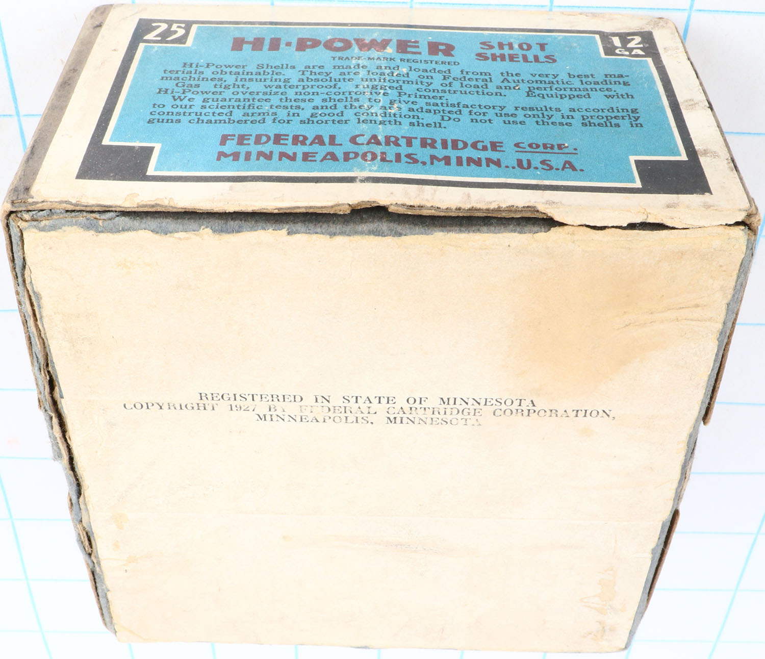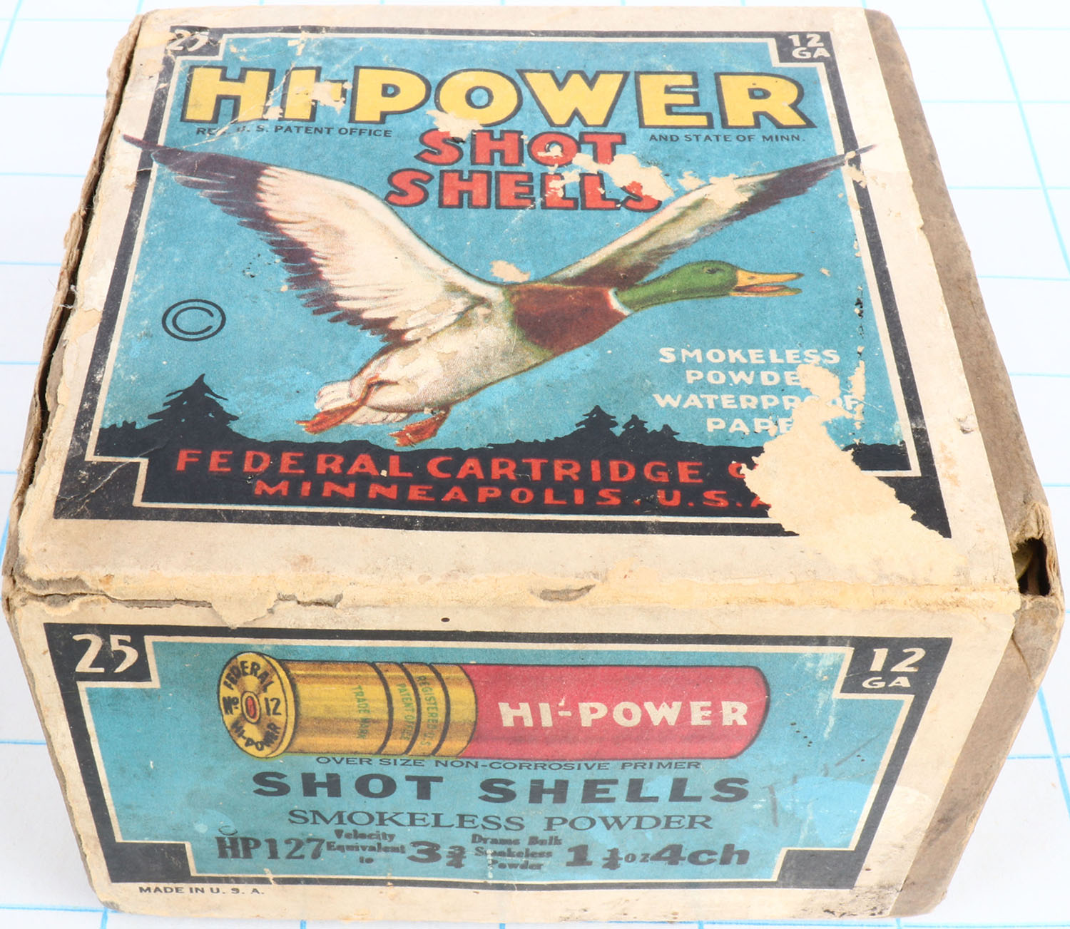 Federal Cart. Co., HI-POWER, 12ga., 2 PIECE!, FULL of incorrect shot/brand, shot size 4ch, blue box with multi colored label that pictures Mallard in flight, box has seam splits, scuffing & light soiling with very nice label, Shells are very good. Grade: Very Good ++ - Value: 60 to 200