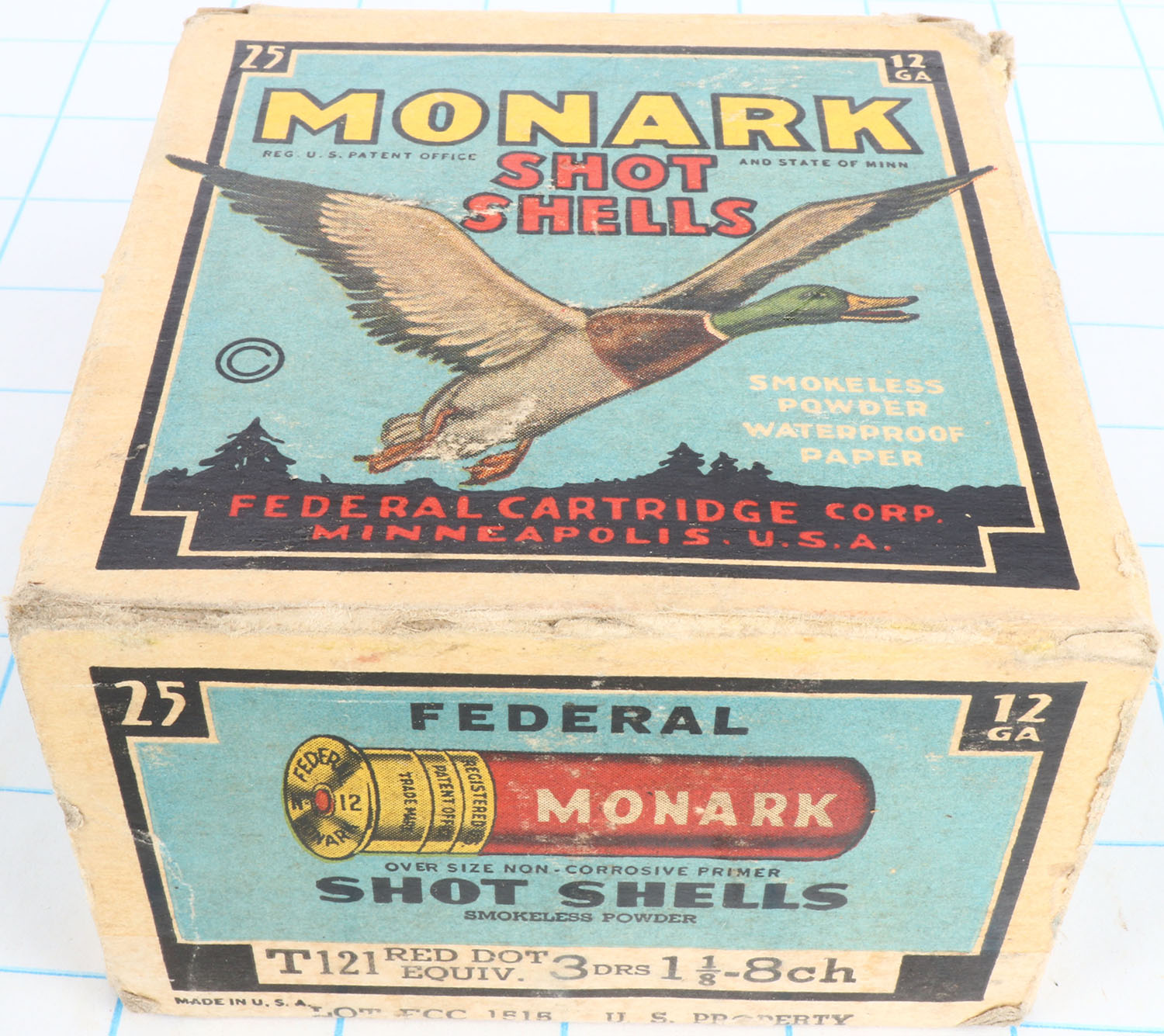 Federal Cart. Co., MONARK U.S. Property, 12ga., 1pc., Full, shot size 8ch, Black border, blue, yellow and red box with flying mallard, box has light soiling & light edge wear with great color, shells are excellent. Grade: Excellent - Value: 10 to 40