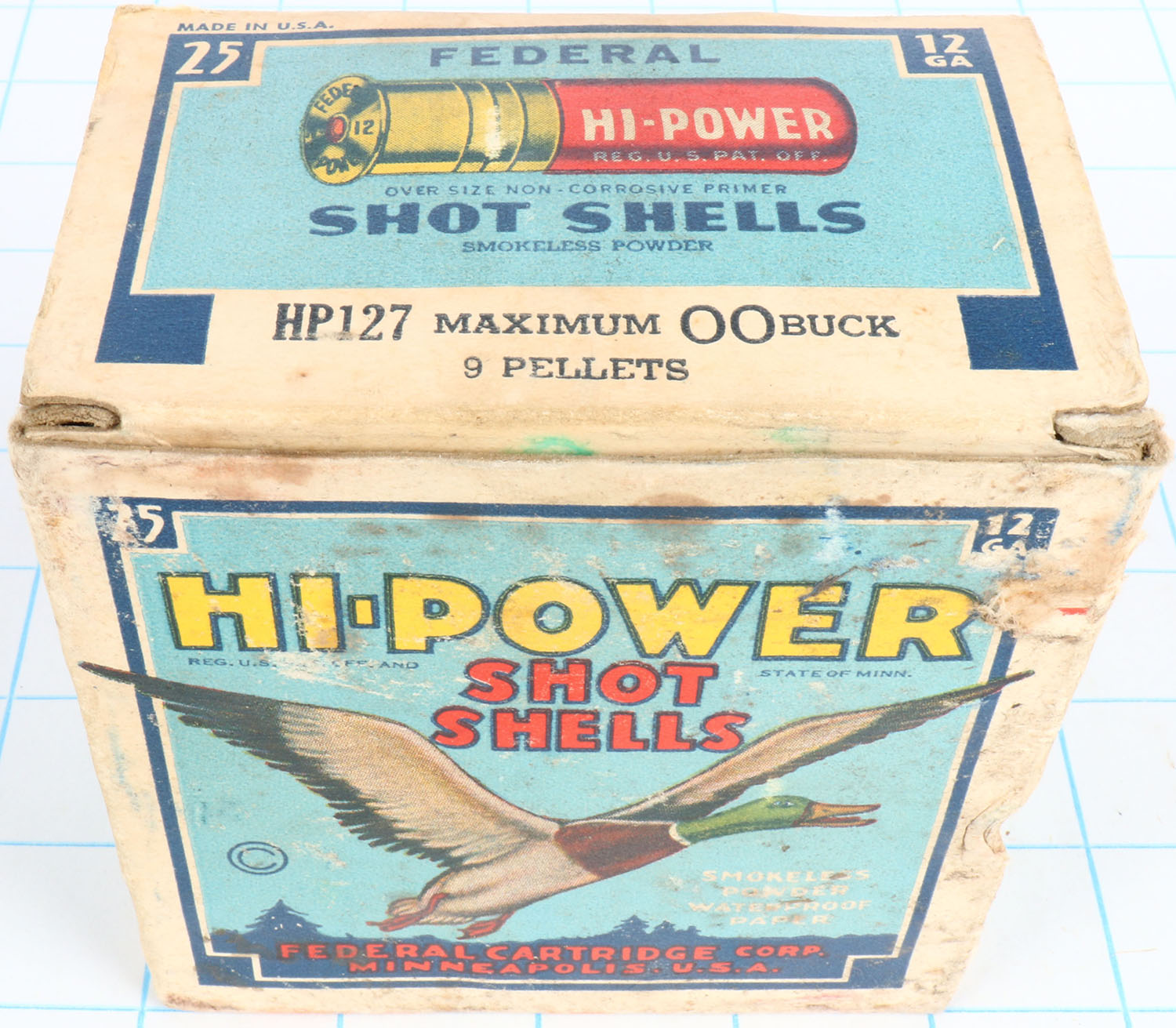 Federal Cart. Co., HI-POWER, 12ga., 1pc., Partial 22rds., shot size 00 Buck, Blue border, blue, yellow and red box with flying mallard, box has light soiling, light edge wear & light scuffing with great color, Shells are excellent. Grade: Excellent - Value: 10 to 50