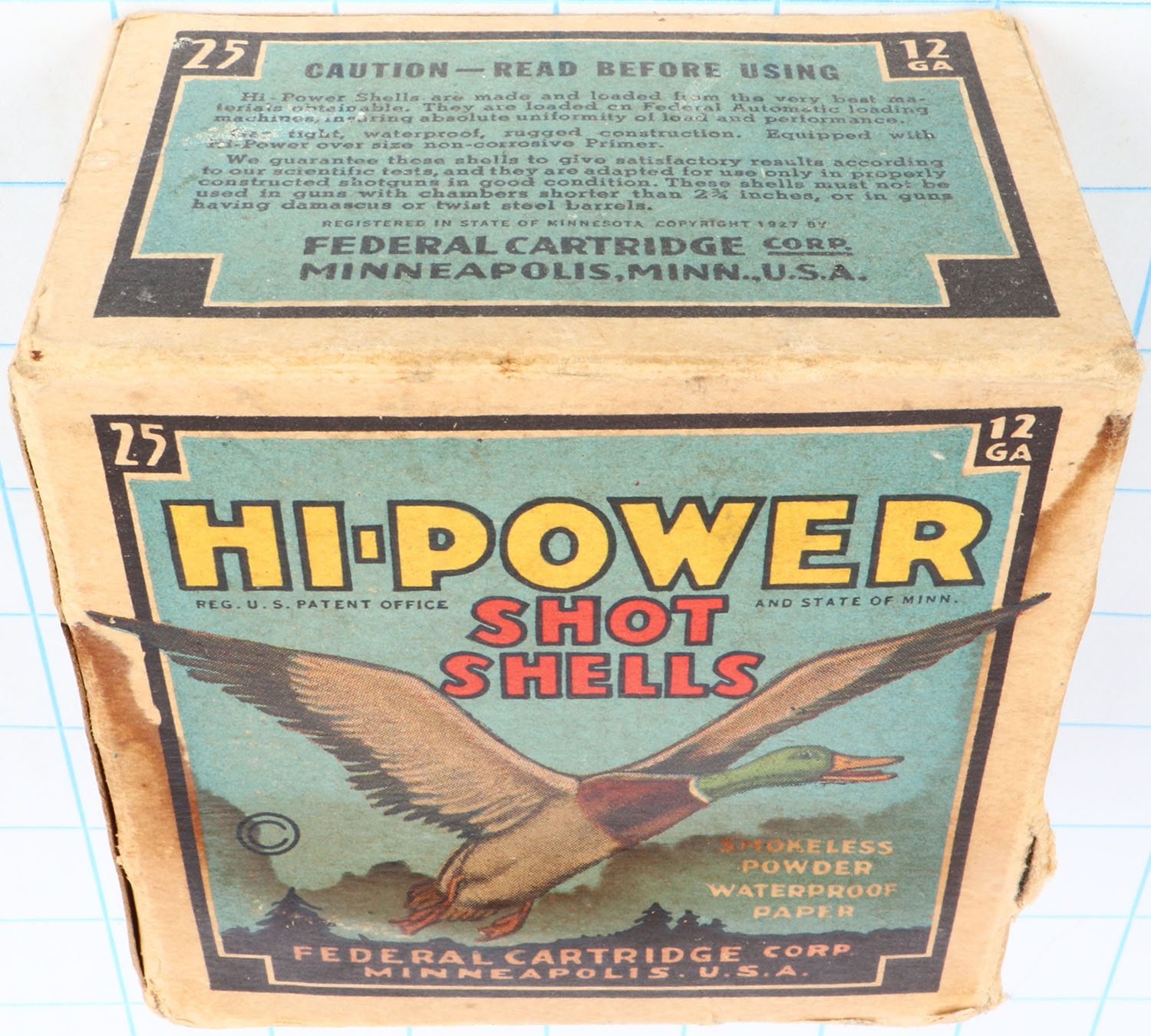 Federal Cart. Co., HI-POWER, 12ga., 1pc., Full, shot size 6, Black border, blue, yellow and red box with flying mallard, box has soiling, light edge wear & shell protrusion with very nice color, Shells are very good. Grade: Excellent - Value: 10 to 40