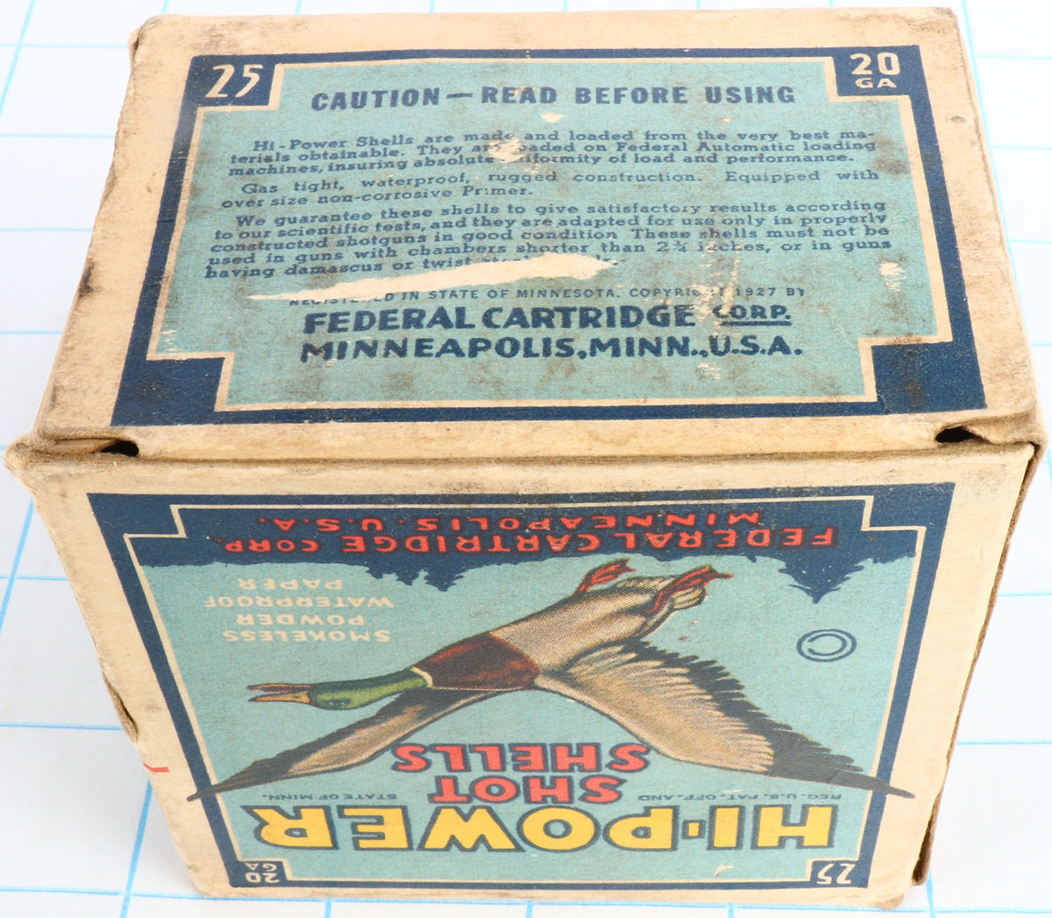 Federal Cart. Co., HI-POWER, 20ga., 1pc., Empty, shot size 4 Magnum, Blue border, blue, yellow and red box with flying mallard, box has light edge wear & light soiling with very nice color. Grade: Excellent - Value: 10 to 40