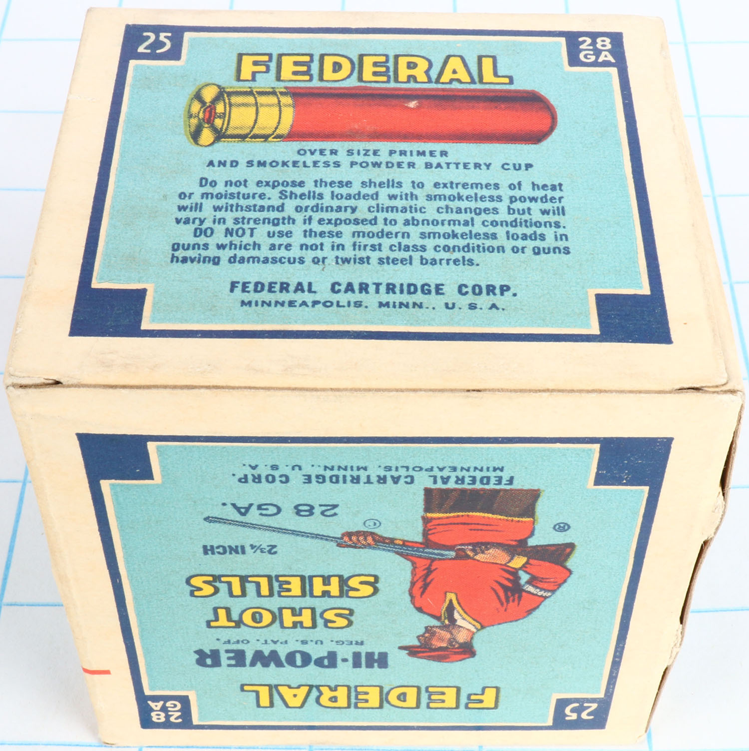 Federal Cart. Co., HI-POWER with Insert, 28ga., 1pc., Full, shot size 6, Blue border, blue, yellow and red box with Trap Shooter, box has shell protrusions with great color, shells are excellent. Grade: Excellent + - Value: 20 to 60