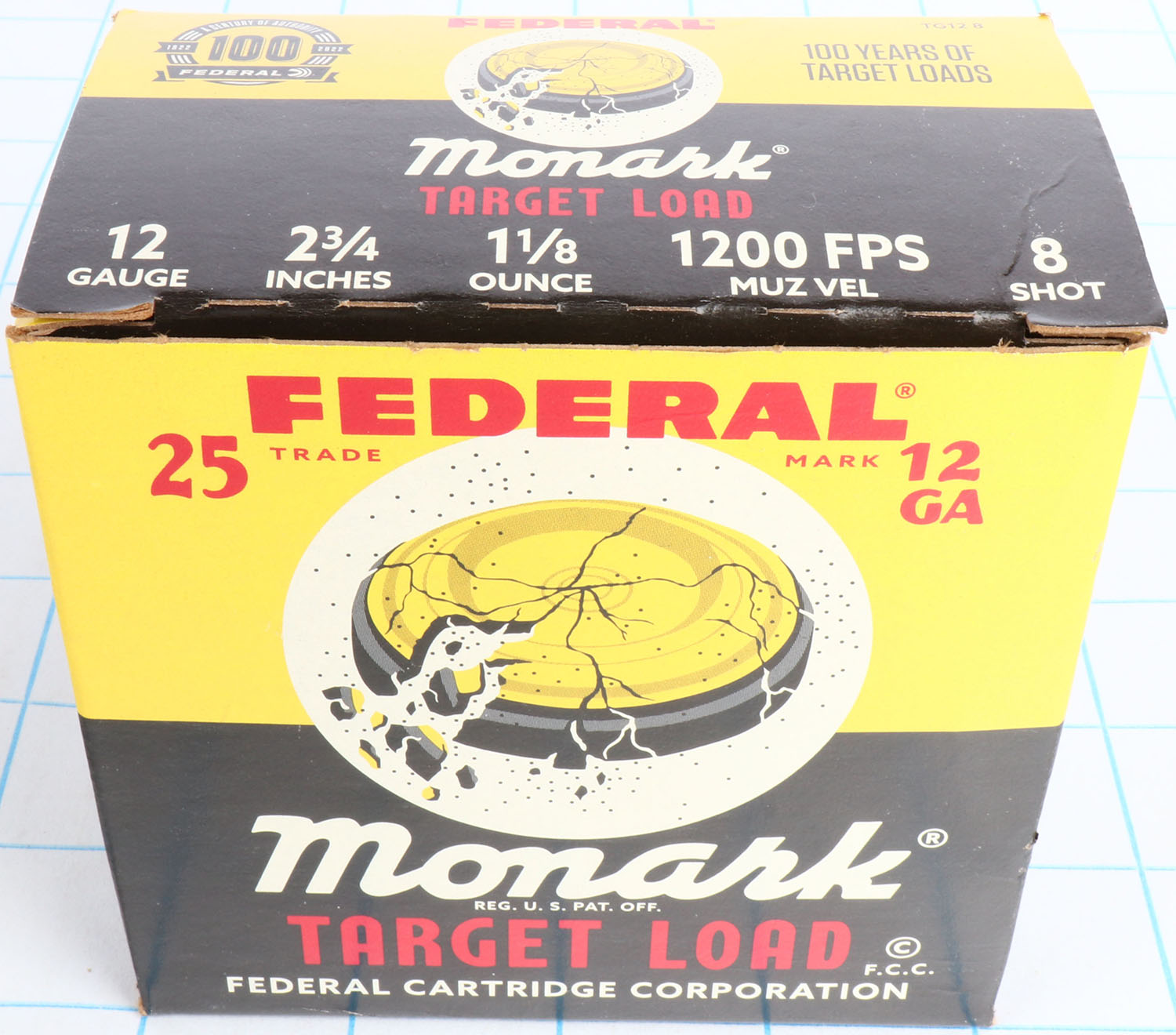 Federal Cart. Co., Monark 100 Year Anniversary, 12ga., 1pc., Full, shot size 8 Target Load, black, yellow and red box with Trap that has shot all around, box very solid with Minty color box shows earlier boxes and when they were introduced also tells little story about Federal, shells are Minty. Grade: Excellent ++ - Value: 20 to 60