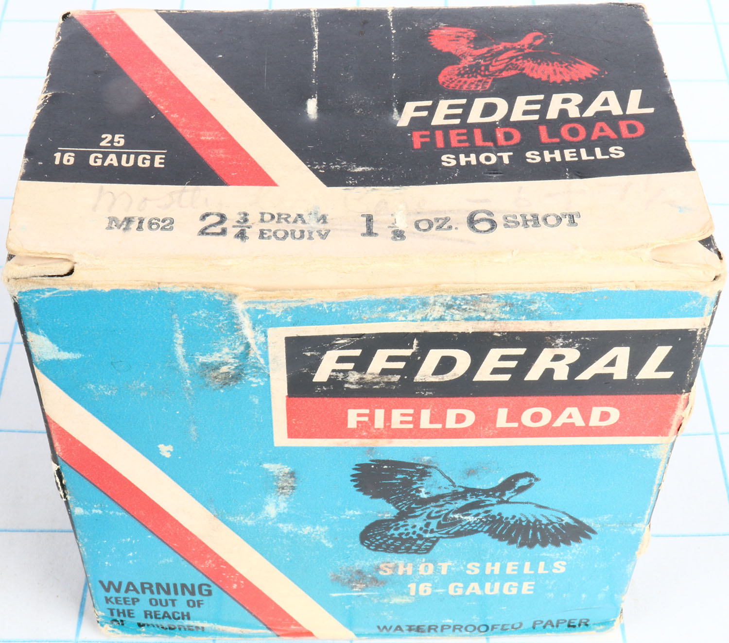 Federal, Field Load, 16ga., 1pc., Full of incorrect brand, shot size 6, box is solid with nice colors, shells are very good. Grade: Very Good ++ - Value: 8 to 30