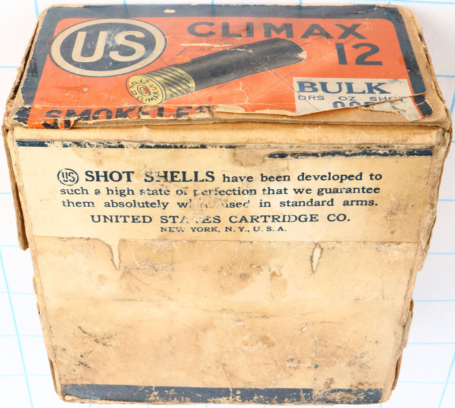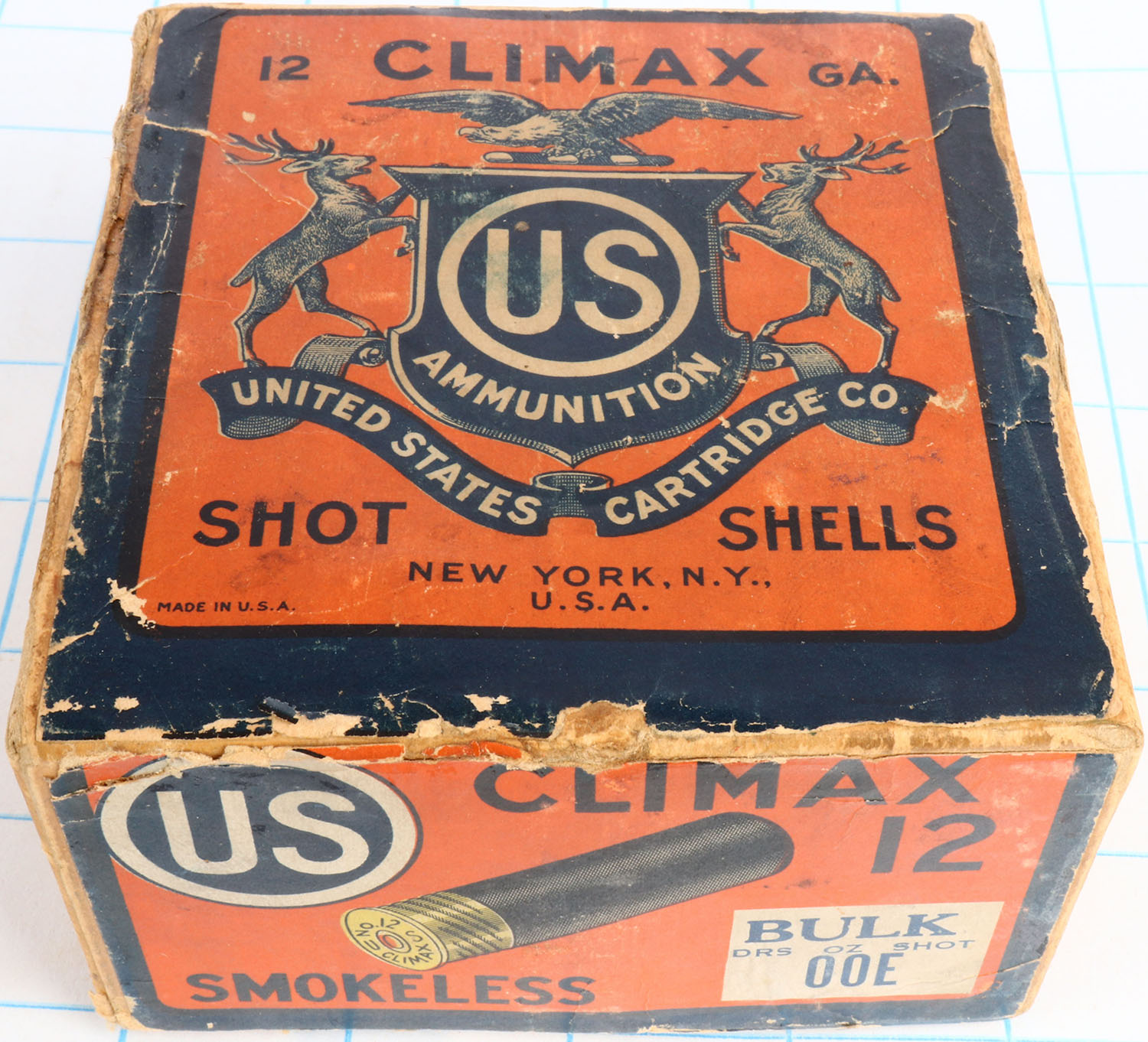 US Cart. Co., New York, NY, Climax, 12ga, 2pc., Empty, shot size 00E, buff box orange, blue & white label, box has edge wear, light soiling & light scuffing with very nice colors. Grade: Very Good ++ - Value: 20 to 80