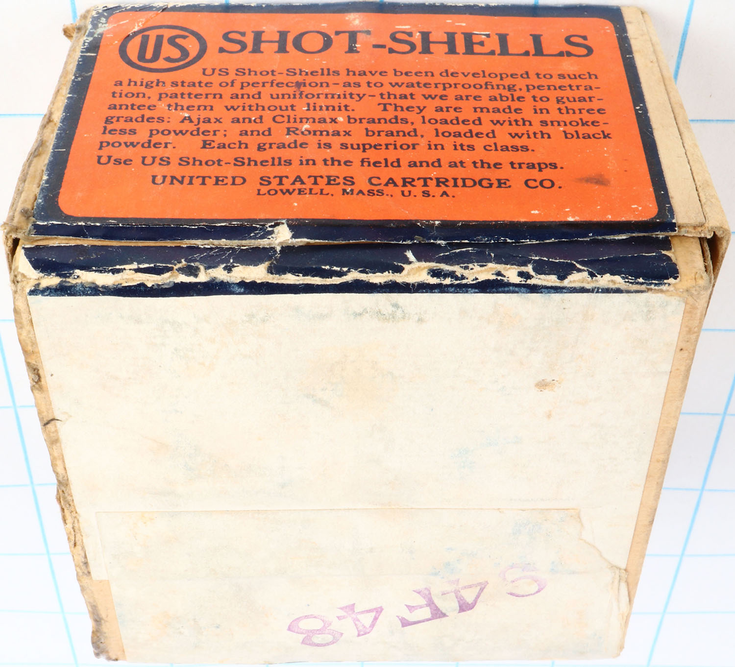 US Cart. Co., Lowell, Mass., Climax, 20ga, 2pc., Full with 1rd being incorrect shot size, shot size 7 1/2 C, buff box orange, blue & white label, box has glue repair & edge wear with great colors. Grade: Excellent - Value: 20 to 80