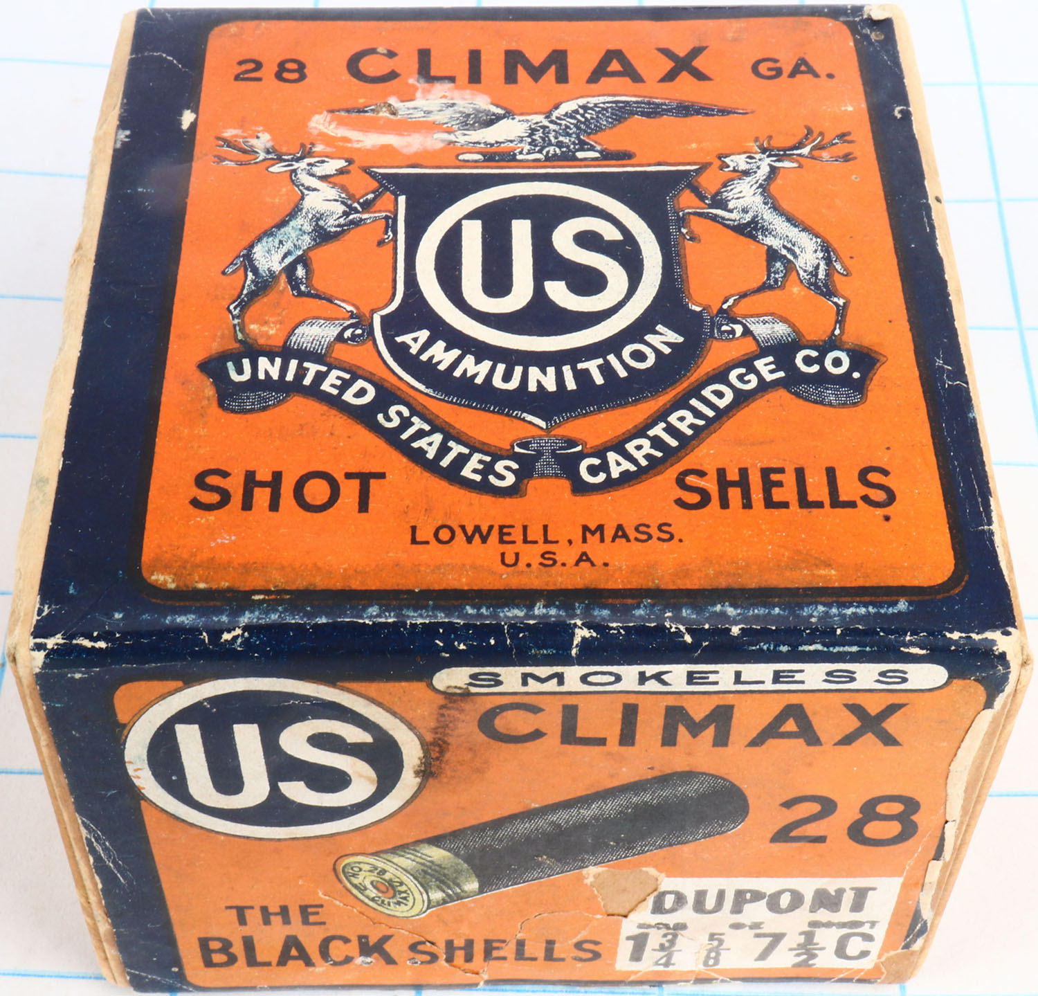 US Cart. Co., Lowell, Mass., Climax, 28ga, 2pc., Partial 15rds, shot size 7 1/2 C, buff box orange, blue & white label, box has seam splits, light edge wear & light soiling with great colors, shells are very good. Grade: Excellent - Value: 50 to 200