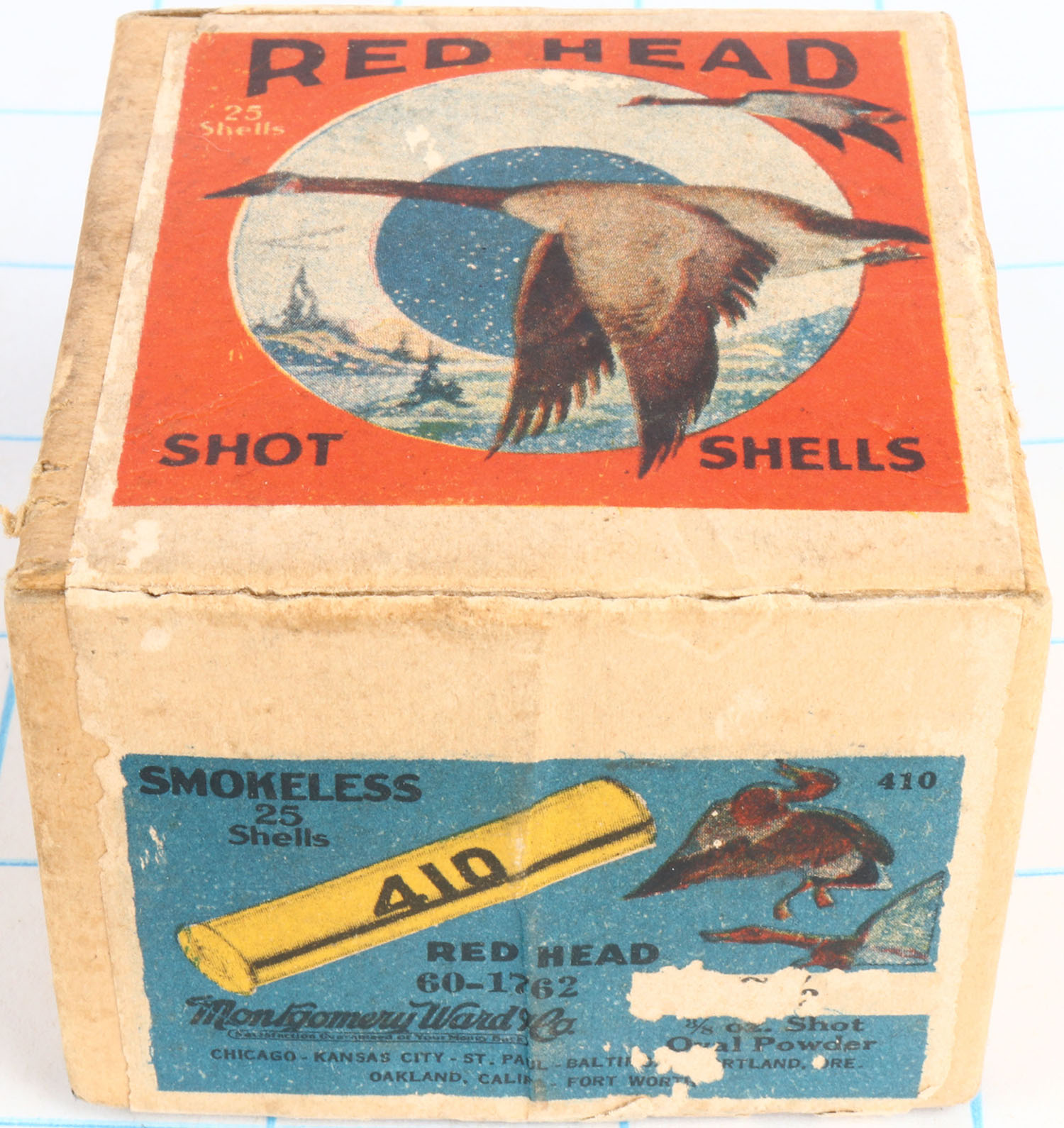 Montgomery Ward & Co., Red Head, 410ga., 2pc., Full, 2 1/2'', Shot size 7 1/2, ALL BRASS SHOT SHELLS, buff box with multi colored scene & two geese flying, correct bottom label, box is very solid with light scuffing & great colors, No. 60-1762. Shells are excellent. Grade: Excellent + - Value: 100 to 800