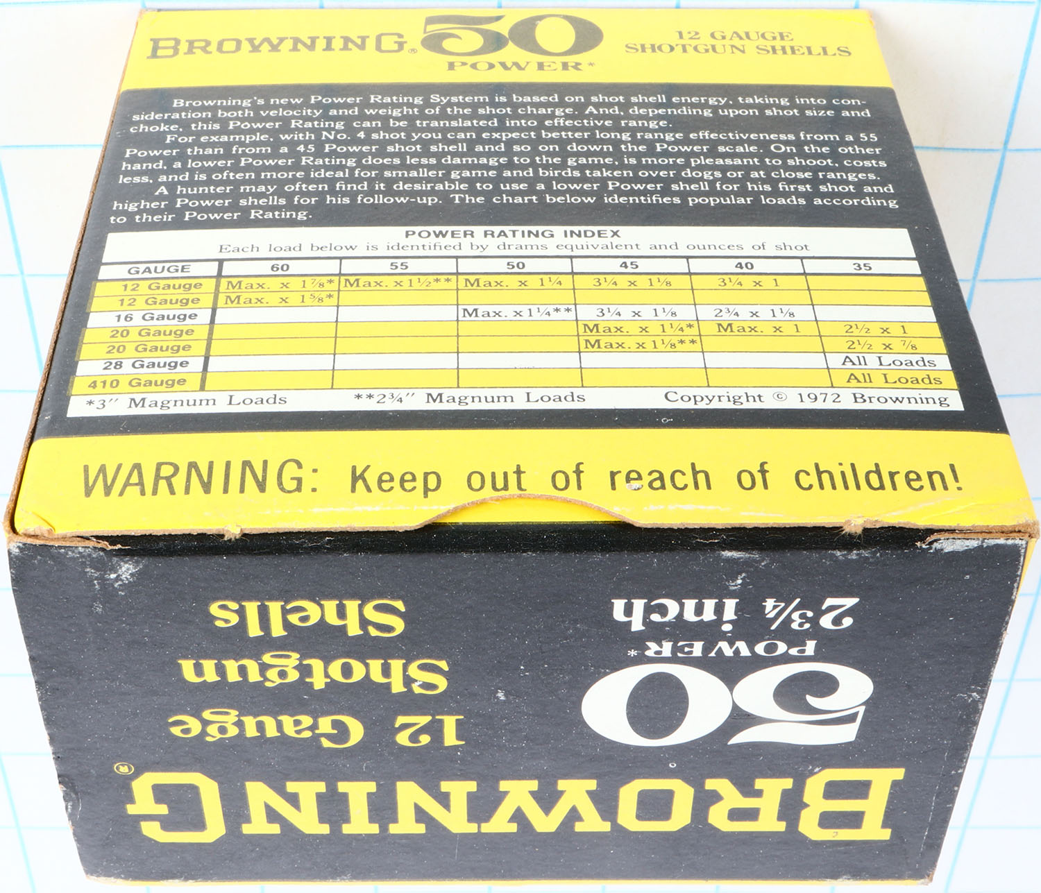 Browning, 50 Power, 12ga., 1pc., Full, shot size 5, 2 3/4'', black, yellow & white box, box is solid with great color, shells are excellent. Grade: Excellent + - Value: 10 to 40