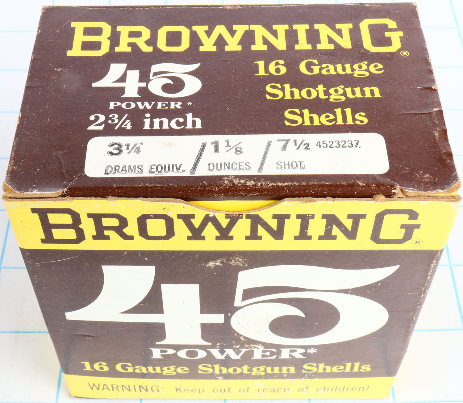 Browning, 45 Power, 16ga., 1pc., Full, shot size 7 1/2, 2 3/4'', brown, yellow & white box, box is solid with great color, shells are excellent. Grade: Excellent + - Value: 10 to 40