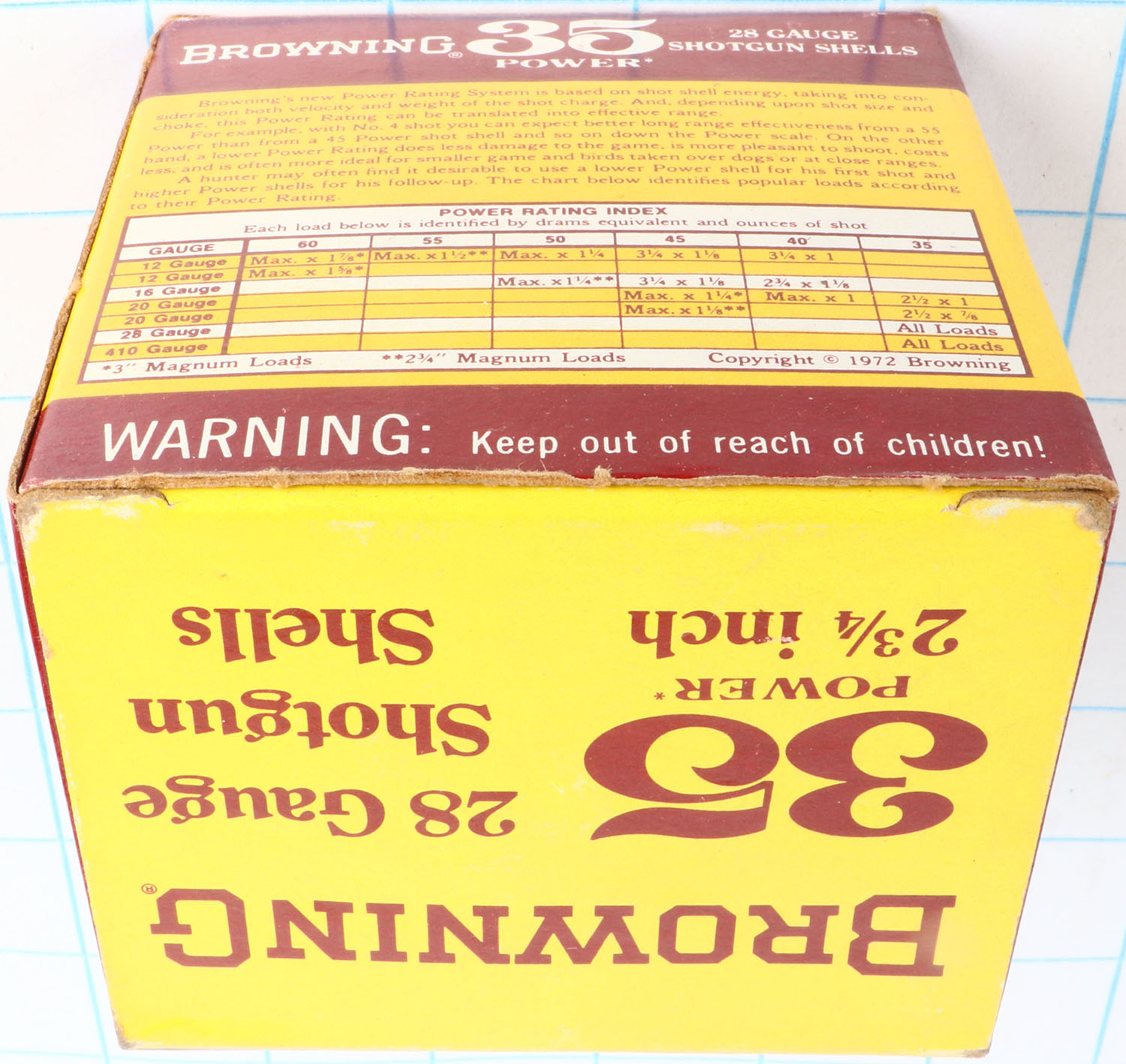 Browning, 35 Power, 28ga., 1pc., Partial 23rds, shot size 9, 2 3/4'', maroon, yellow & white box, box is solid with great color, shells are excellent. Grade: Excellent - Value: 10 to 40